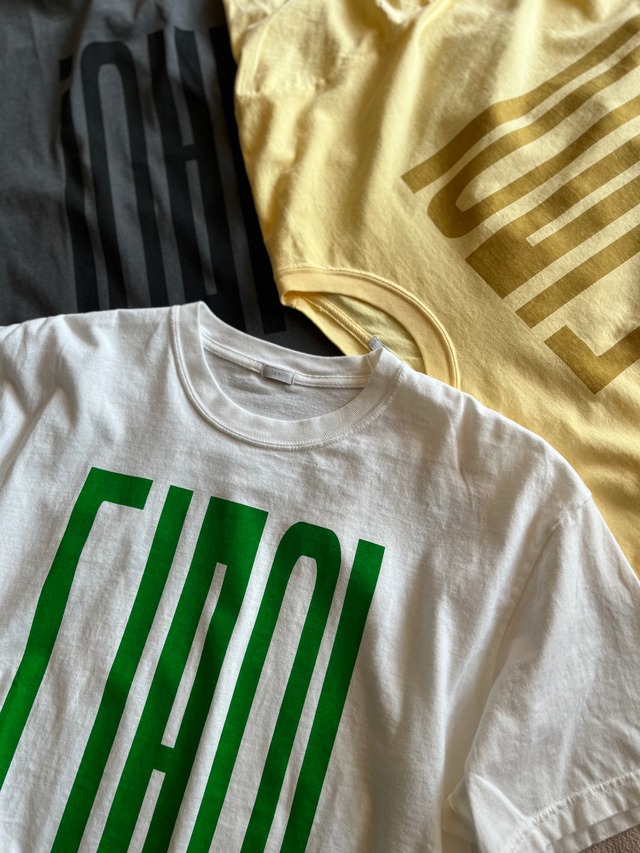 素材 : コットン100% 色 : WHITE YELLOW CHAROAL レディースフリーサイズ(身長170cm前後の男性の方も短丈として着用可能) 着丈 61cm 身巾 58cm 肩巾 56cm 袖丈 22cm リピート率が高いichiのビッグロゴTシャツが入荷してきました‼︎今回はヴィンテージのようにフェード感を楽しめる柔らかい風合いのピグメントTシャツ。 パリの街中にあるアートのような落書きや、壁に貼ってある様々なポスターからのインスピレーションから生まれたメッセージ。プリントは①oui non ②amore mio! ③ciao! amoriの3種類。どれも良すぎて選びきれず10色オーダーという過去最高の色数に…。いつも安全すぎる遊びのないオーダーをするのですが今回は攻めてみました☺︎攻めすぎました。 こちらはフロントにCIAO!、バックはAMOREとイタリア語が大きくプリントされた1枚。アモーレというと長友選手を思い出しますね♩大切な方々と集まる日にも着ていきたくなります。 ヴィンテージのようなくったり柔らかな風合いのピグメントTシャツ。ドロップショルダーでリラックス感のあるシルエットのオーバーT。ボックスシルエット、肘まで隠れる袖丈、ドロップショルダーで自然と体系カバーもしてくれる万能Tシャツです☺ 【ichi】 モノがたくさんあふれる時代だからこそ、モノを大切にしたい… 古き時代からあるモノ、自分たちの着続けたいモノをカタチにしました。 着て身体に馴染み、色あせていくことで自分らしい色に変わっていく服、 着続けることが喜びとなる服。 福岡での生活を拠点にして生み出されるデザインを、日本各地、世界で製造しています。 着て洗うことでテキスタイルの表情や風合いの変化を楽しめる1着。 生地の変化と同時に服が自分の身体のラインに馴染む心地よさも感じてください。