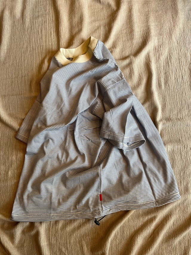 素材: コットン100% 色: ナチュラル×ブルー ボーダー、ブラック×ナチュラル ボーダー M 着丈70.3cm 肩幅52.9cm 身幅60.2cm 袖丈24.7cm L 着丈72.4cm 肩幅55.9cm 身幅63.5cm 裄丈25.4cm (身長170cm Mサイズ着用) 全色買いしたいくらい楽しみにしたHealthknitの Tシャツが到着‼︎ 柔らかく肌触りの良いU.S.コットンを使用し、90年代の少しレトロな空気を感じるような、細いピッチのボーダー柄に仕上げました。 遠目には無地にも見える、絶妙なピッチのボーダーです。 素材としては厚すぎず薄すぎない、ちょうど良いウェイト感です。 ワイドなサイズ感と、少し長めの袖丈がポイントです。 裾についているドローコードでシルエットを調整できます。 また抗菌防臭加工を施すことで汗ばむ季節でも安心して着用でき、デイリーウェアとして最適な仕上がりです。 左脇に、同色の織柄でさりげなくHealthknitロゴが入ったピスネーム付き。