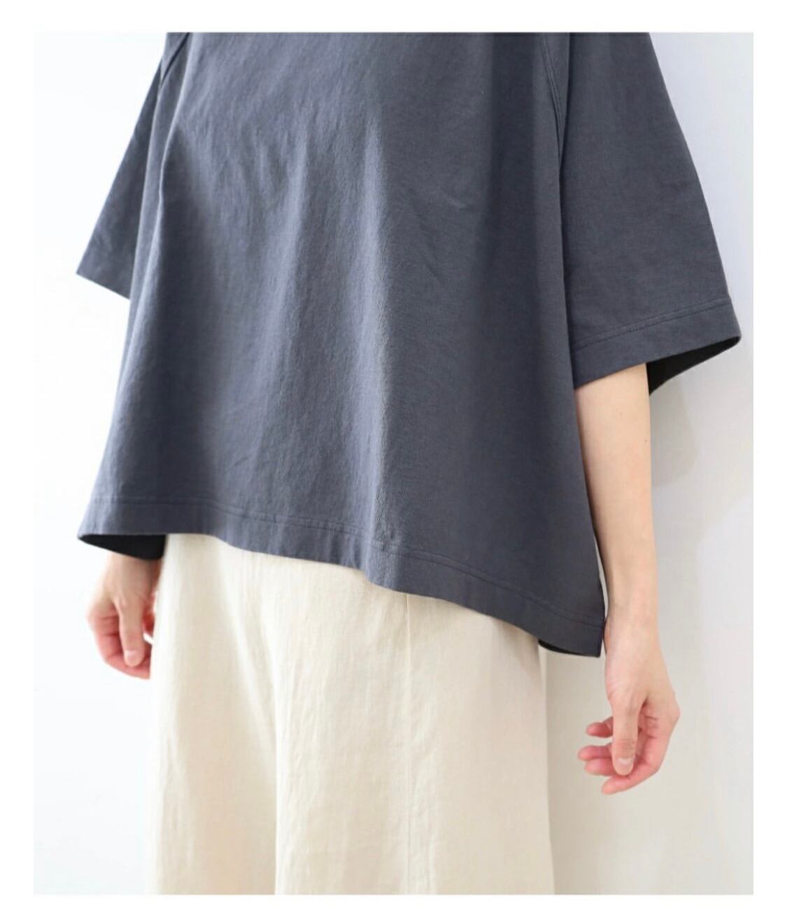自然と体型カバーもしてくれ、透け感の少ない程よい厚みのある天竺は1枚でサマになる嬉しいTシャツです。