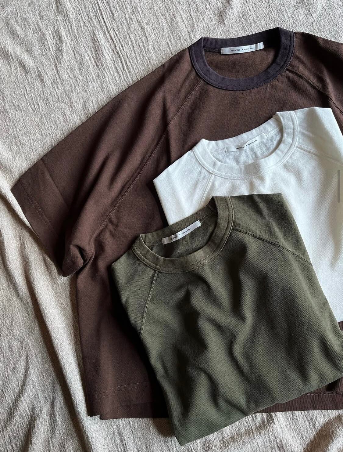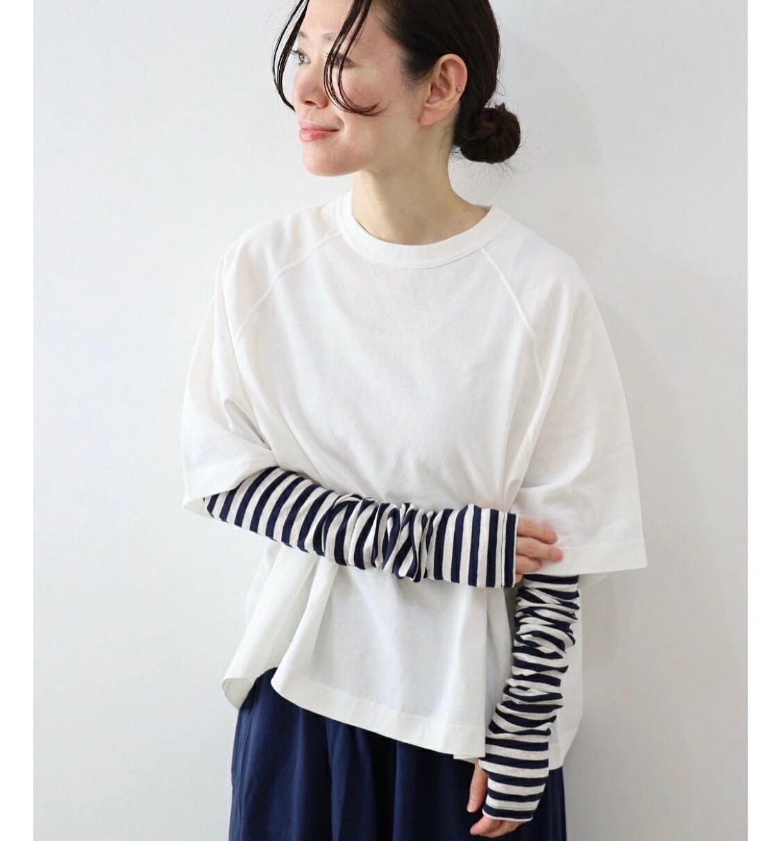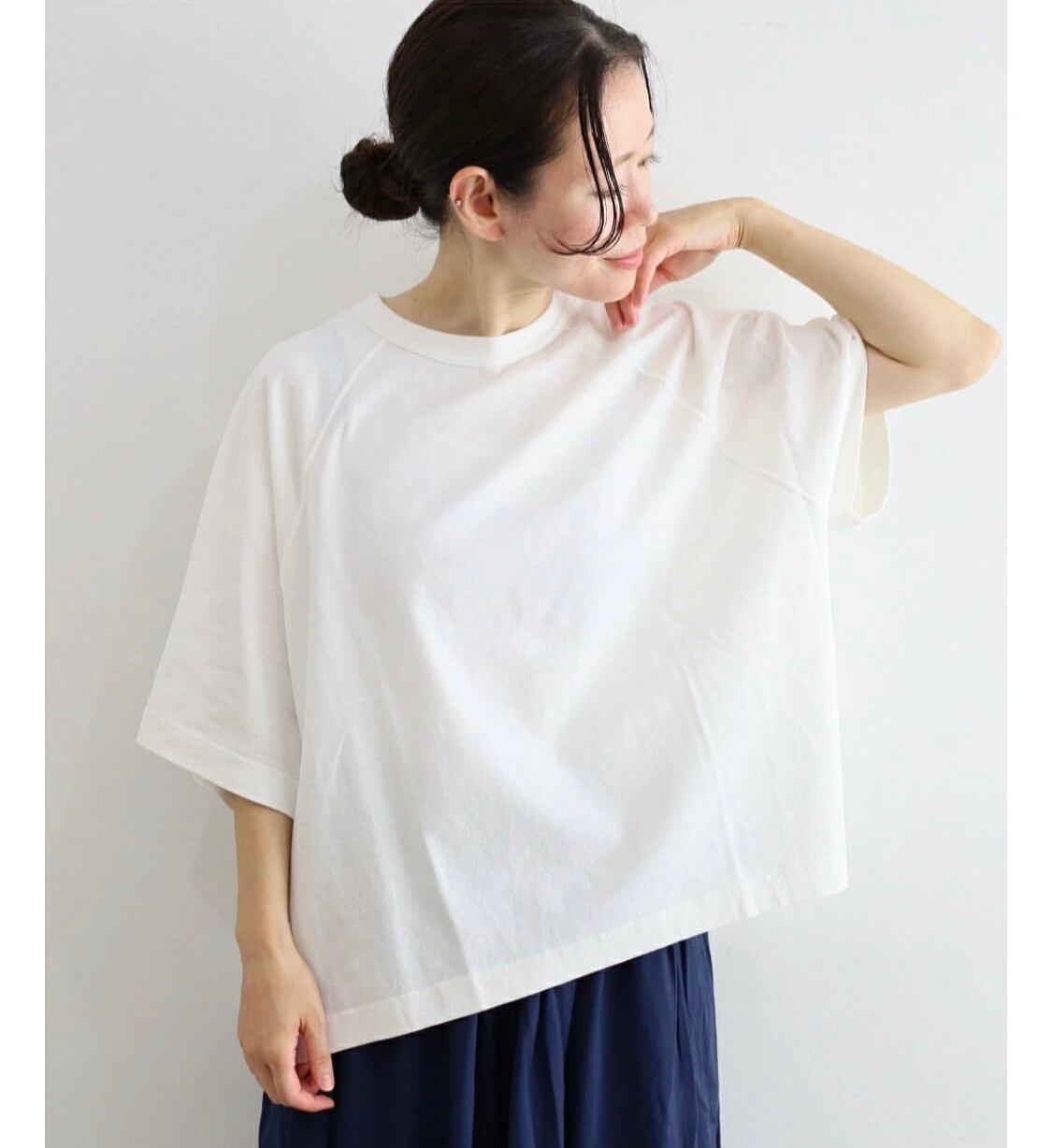 着心地の良さとゆったりとしながら女性らしいシルケットで人気のharmonieのラグランビッグTシャツ。