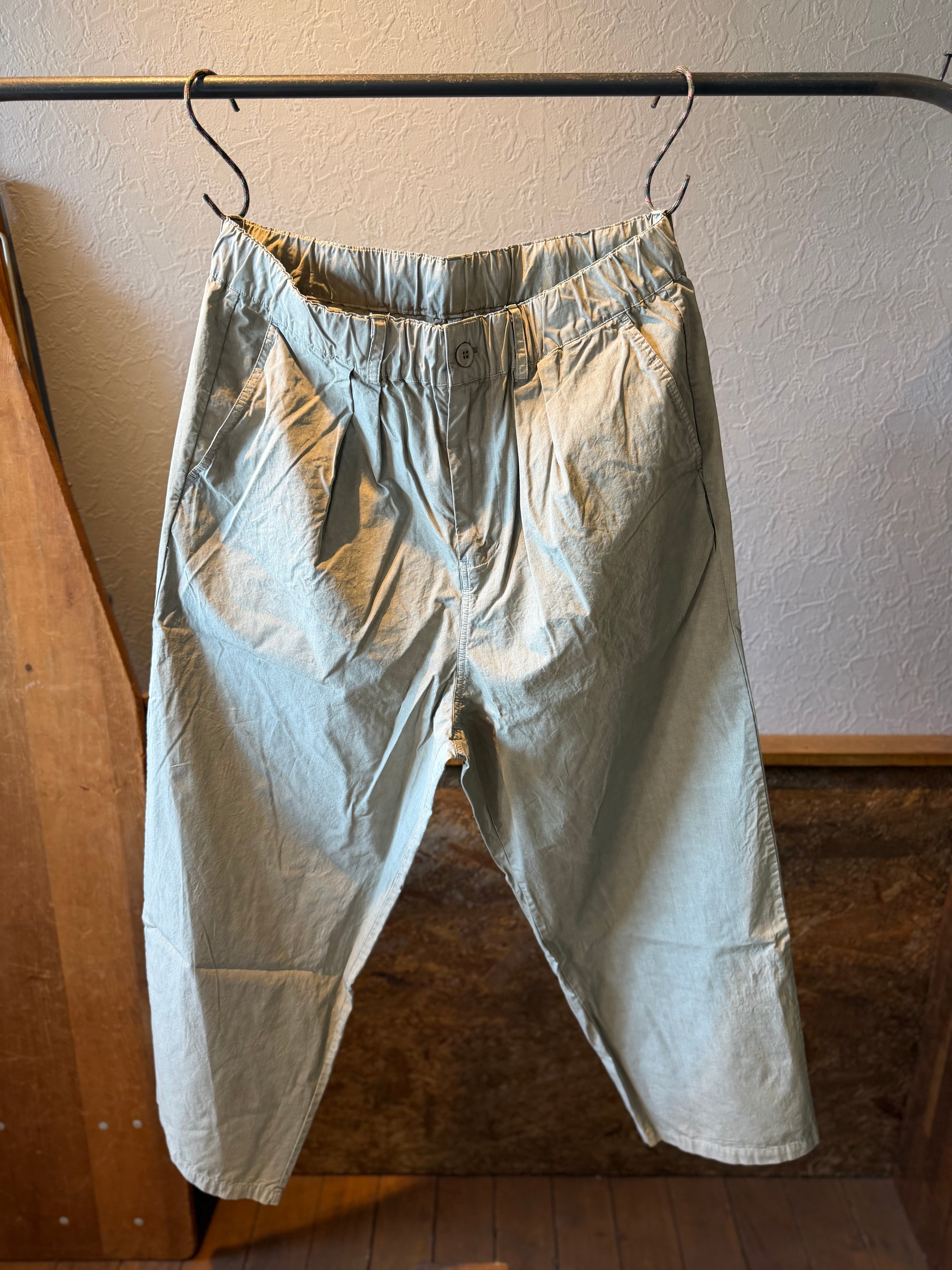 ワイドなシルエットですがゆるやかにテーパードのきいたトップスを選ばない万能パンツ。薄手で独特のハリ感が歩く度に気持ちの良い穿き心地ですよ。
