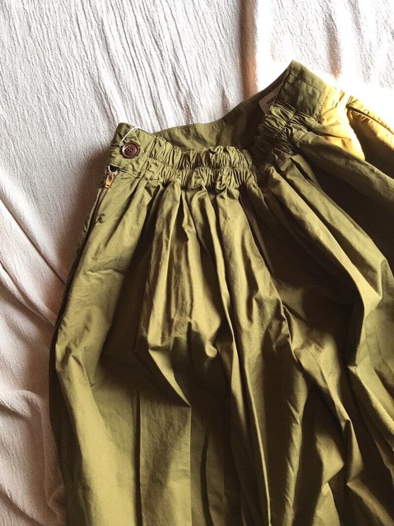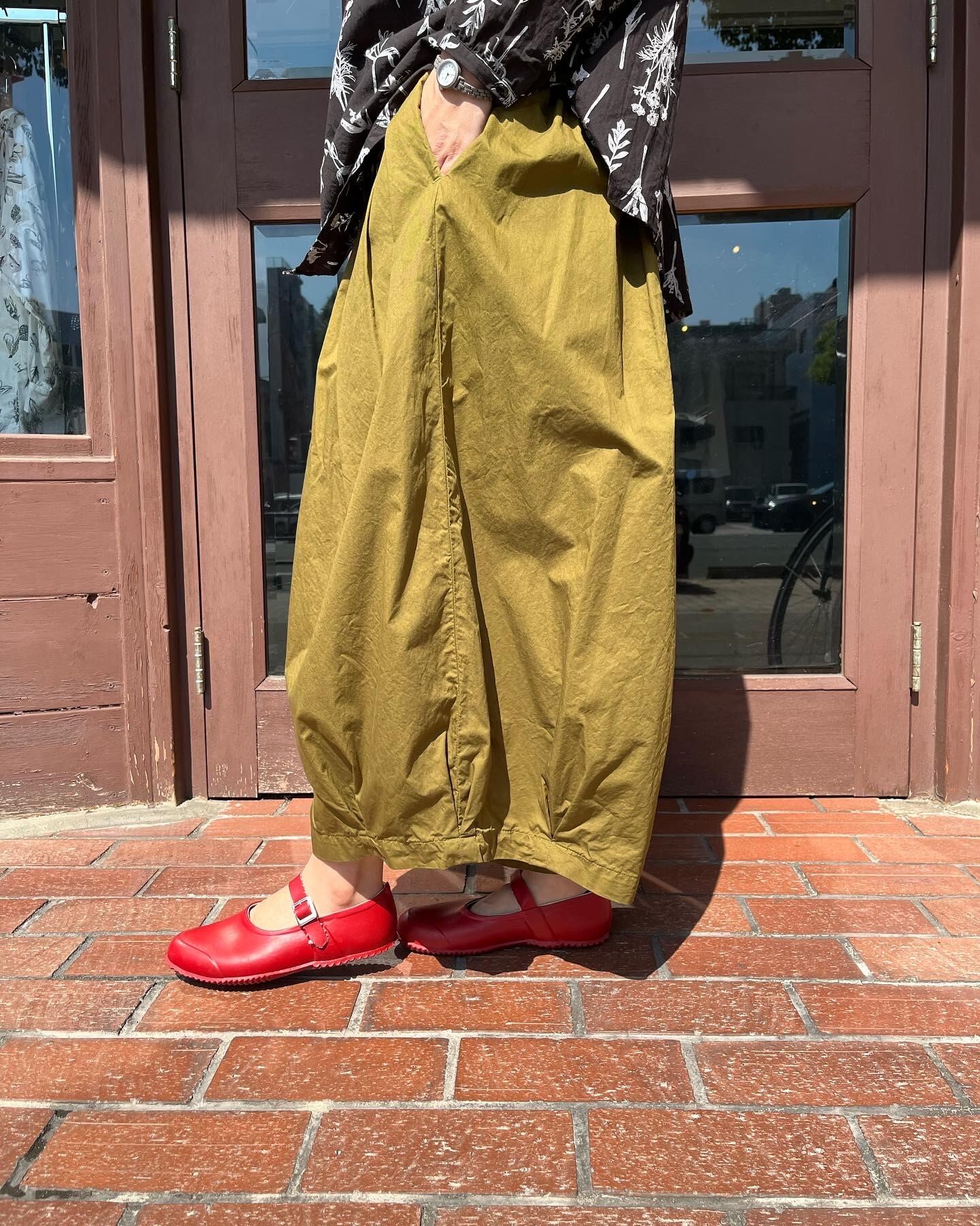バルーンシルエットのロングキュロットパンツです。張りのあるツイル素材で、ウエストとスソのボックスプリーツがきれいなボリューム感を出しています。