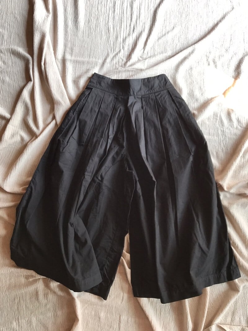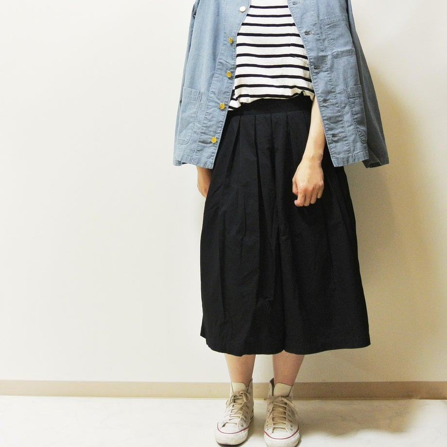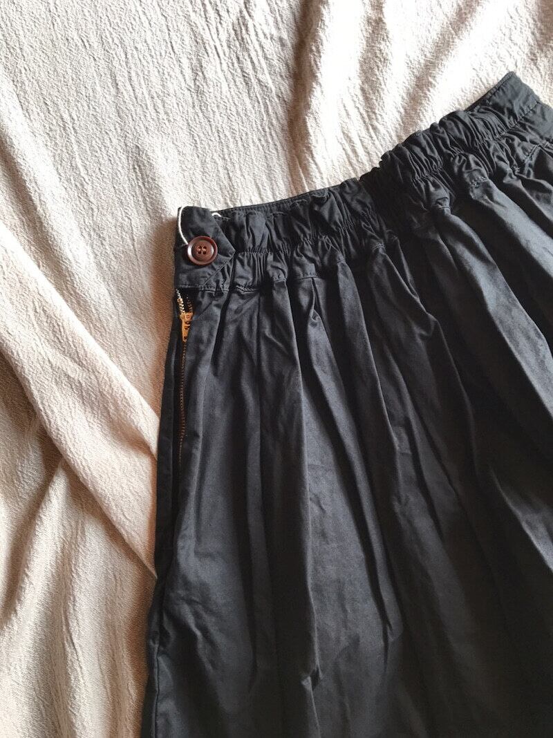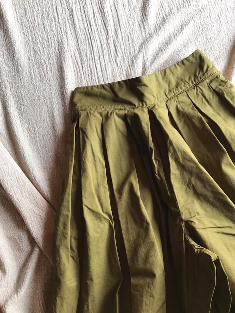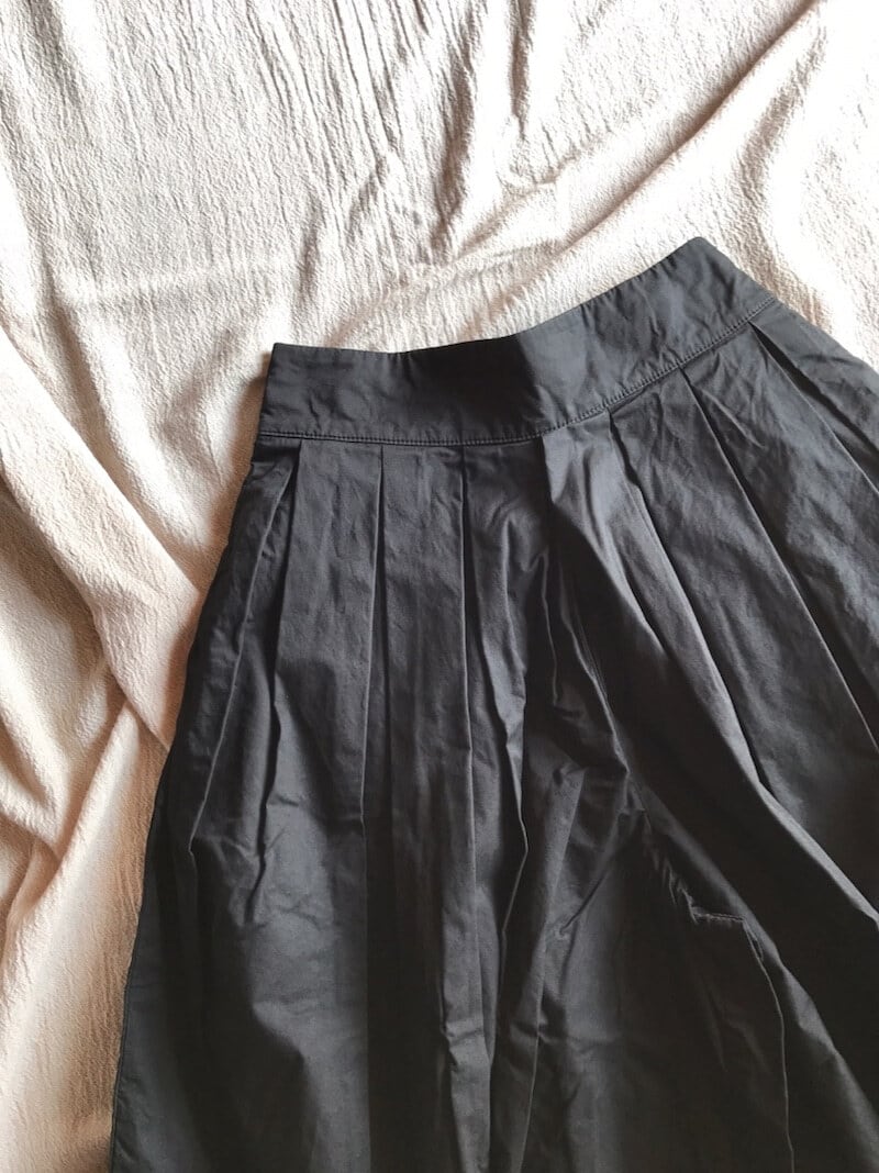 張りのあるツイル素材で、ボックスプリーツがきれいなボリューム感を出しています。