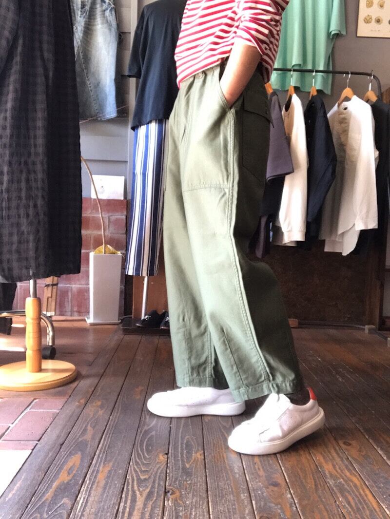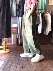 ウエスト周りのゴム仕様とスソのダーツで適度なボリューム感のあるサーカスファティーグパンツ。ワイドシルエットですが、サーカスパンツの形よりもスッキリしたシルエットです。