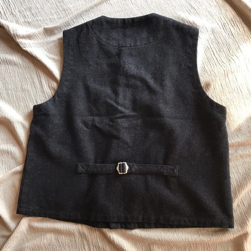 クルーネックはインナーを選ばす重宝しますよ。大きめのポケットや後ろの尾錠などシンプルな中にHARVESTYらしさの詰まったベストです。