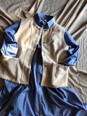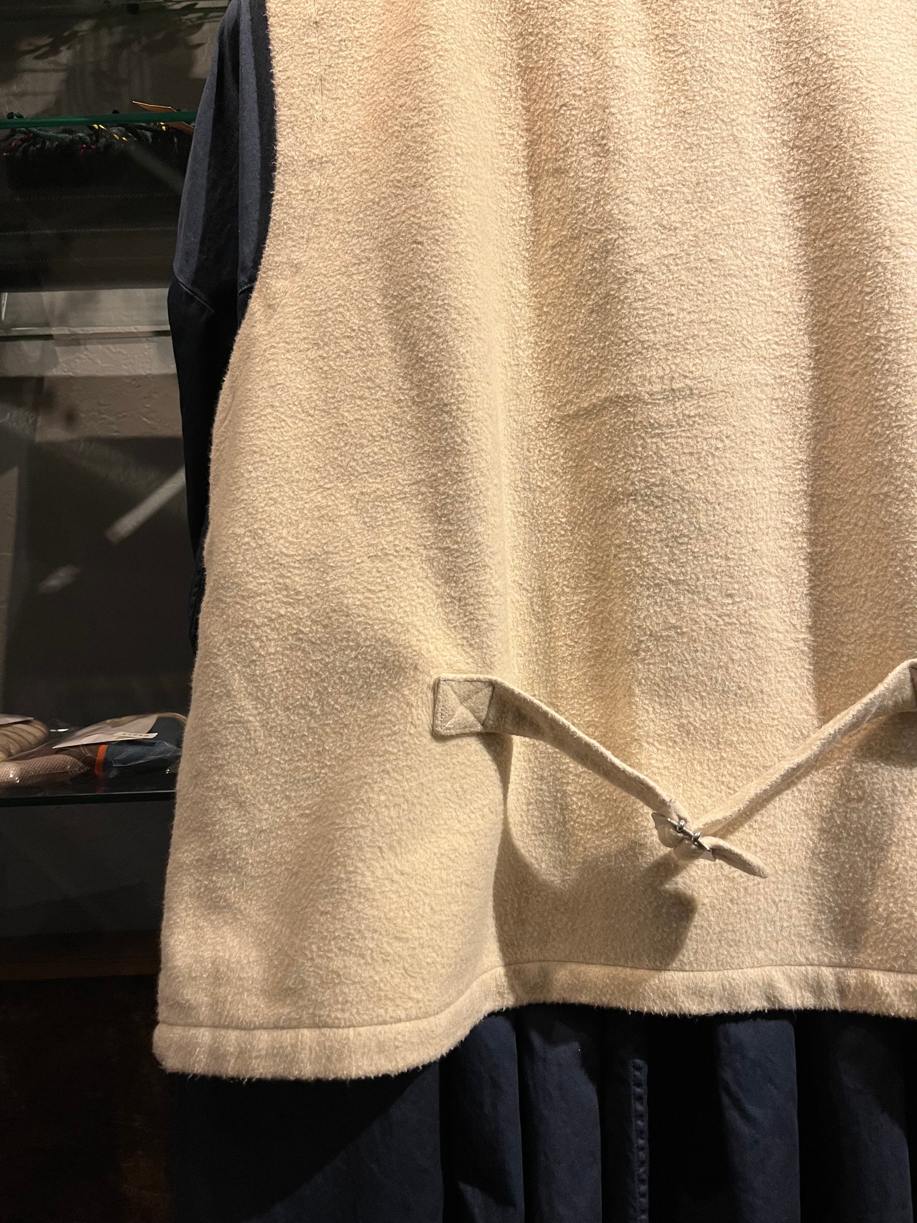 クルーネックはインナーを選ばす重宝しますよ。大きめのポケットや後ろの尾錠などシンプルな中にHARVESTYらしさの詰まったベストです。