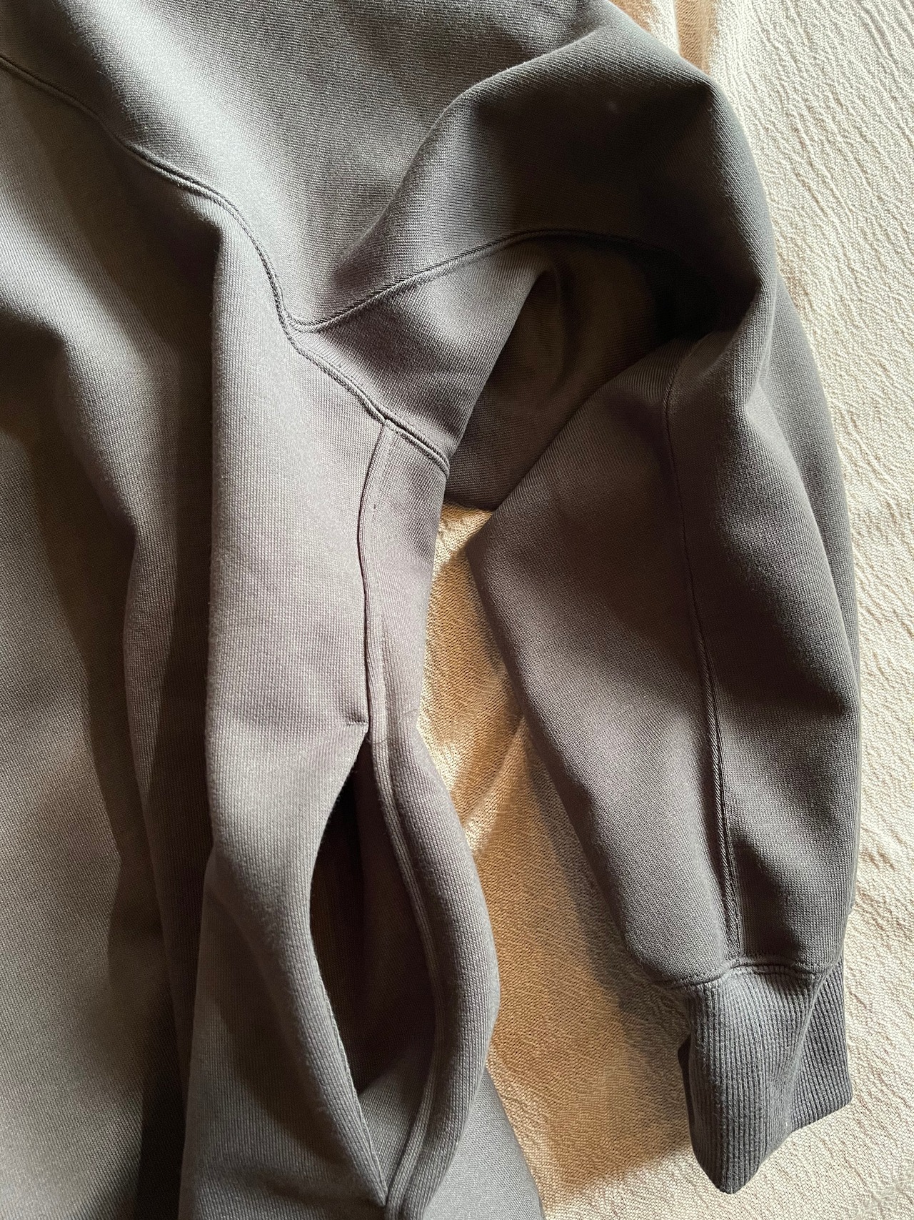 首元の「ガゼット」に「やや長めの裾と袖のリブ」など、ヴィンテージを彷彿させるディテールも盛り込んでいます。