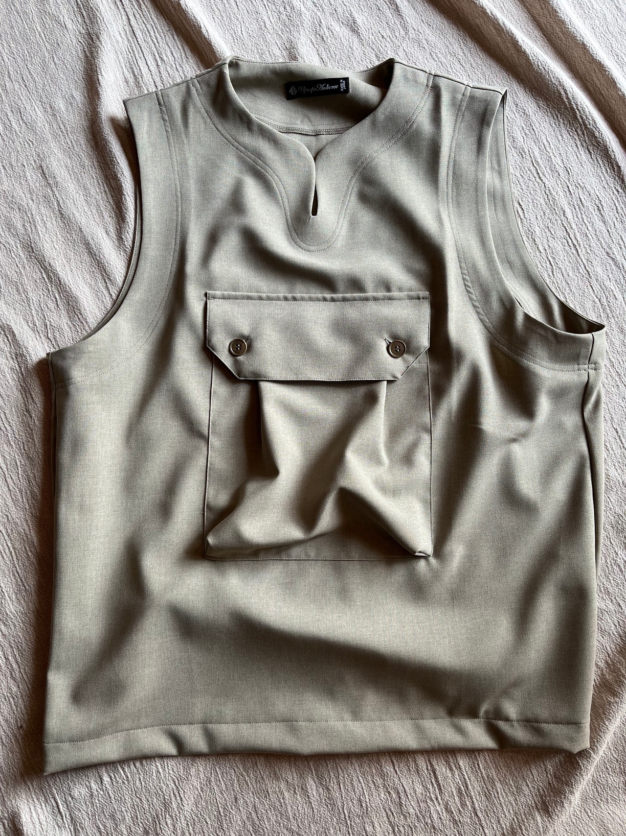 リフラクスリネンライクカナパビッグポケットキーネックベスト/グレーベージュ(Audience)