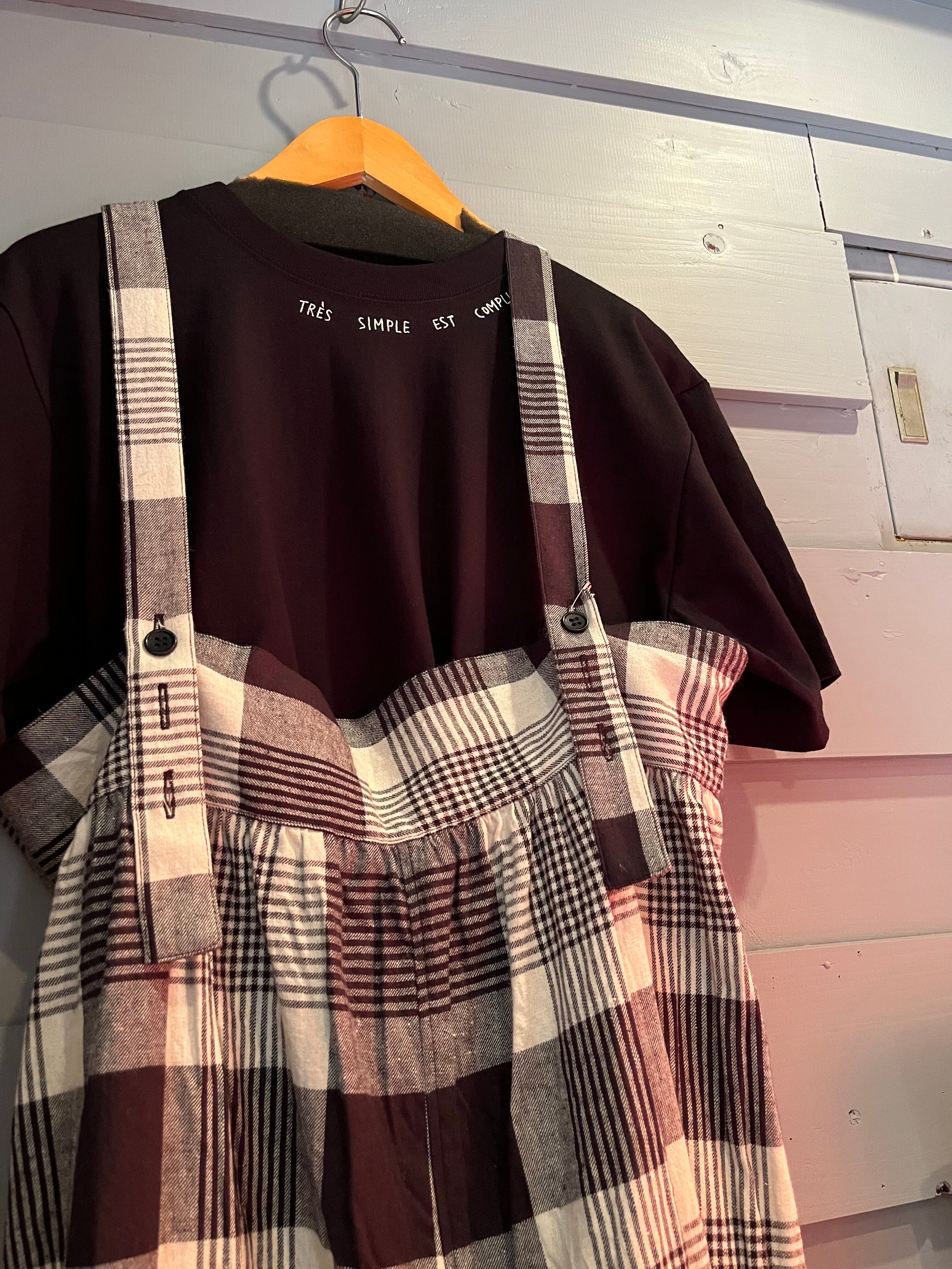 ネックラインに合わせてフランス語Tr´es Simple Est Compliqu´e Embroidery(とてもシンプルなことは複雑である)とメッセージ刺繍された遊び心のあるTシャツ。サラッと肌触りの良い柔らかい着心地。