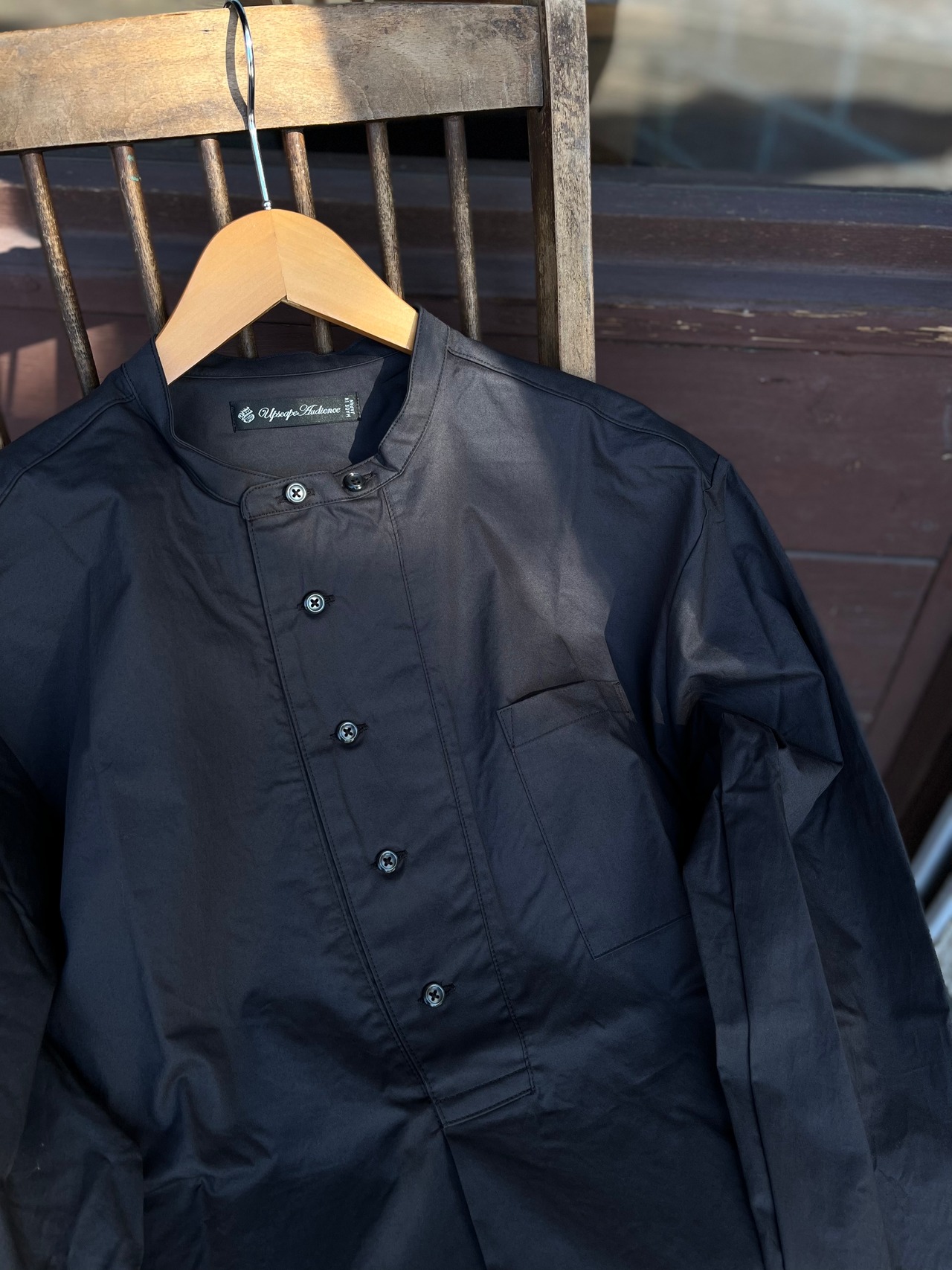 横並びに配置されたボタンもアクセントになってシンプルになりすぎないコックシャツはスウェーデン軍M-55スタンドカラーシャツがイメージソース。