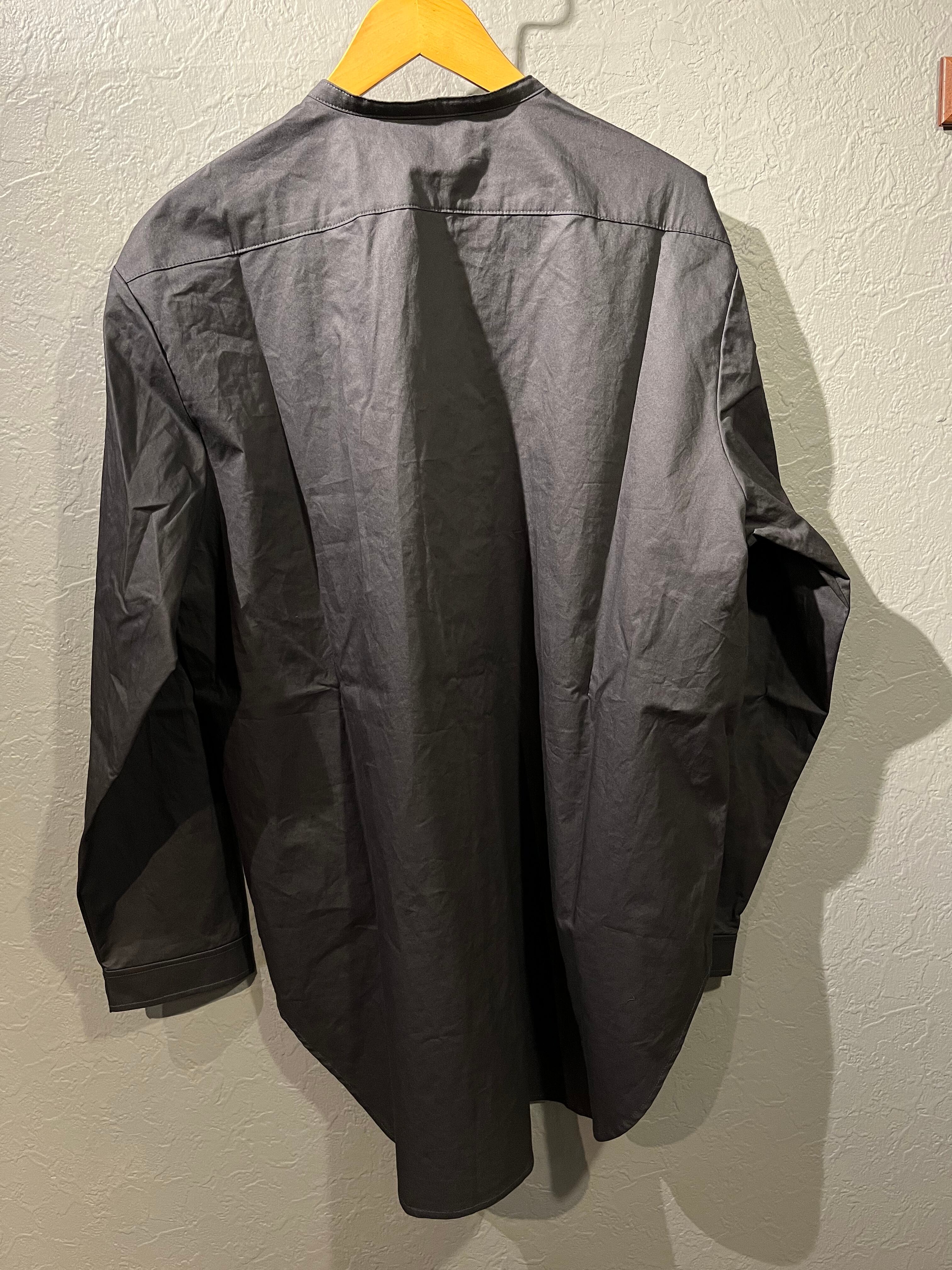スッキリとした襟でリラックス感のあるバンドカラーはインナー使いしやすいので何枚あっても重宝します。横並びに配置されたボタンもアクセントになってシンプルになりすぎないコックシャツはスウェーデン軍M-55スタンドカラーシャツがイメージソース。
