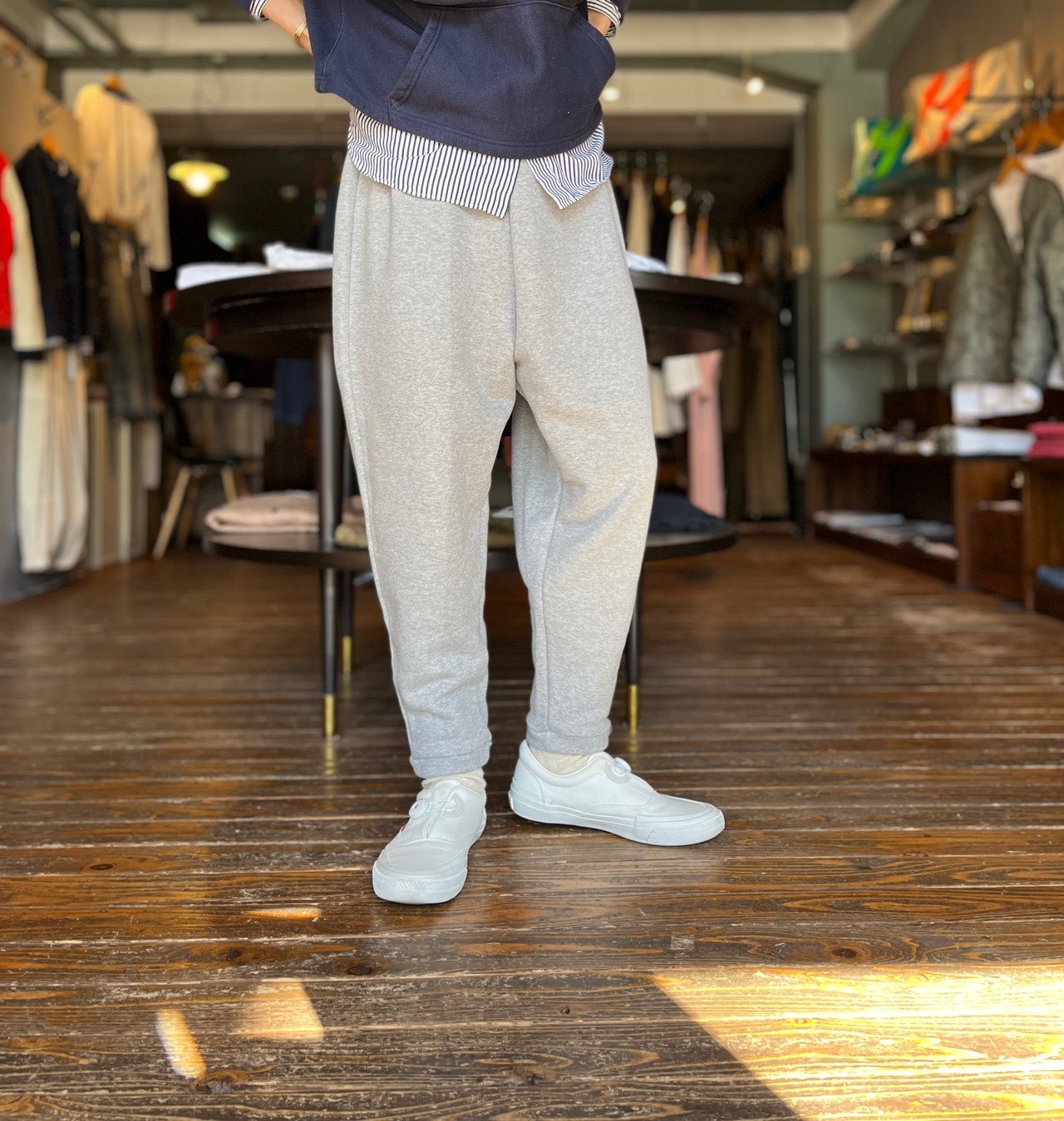ウエスト、股上はゆったりと裾にかけてスッキリと細くなる綺麗なシルエット。リラックス感がありながらカジュアルになりすぎない絶妙なパンツです。ふんわり柔らかい裏毛素材はロングシーズン活躍してくれそうです。