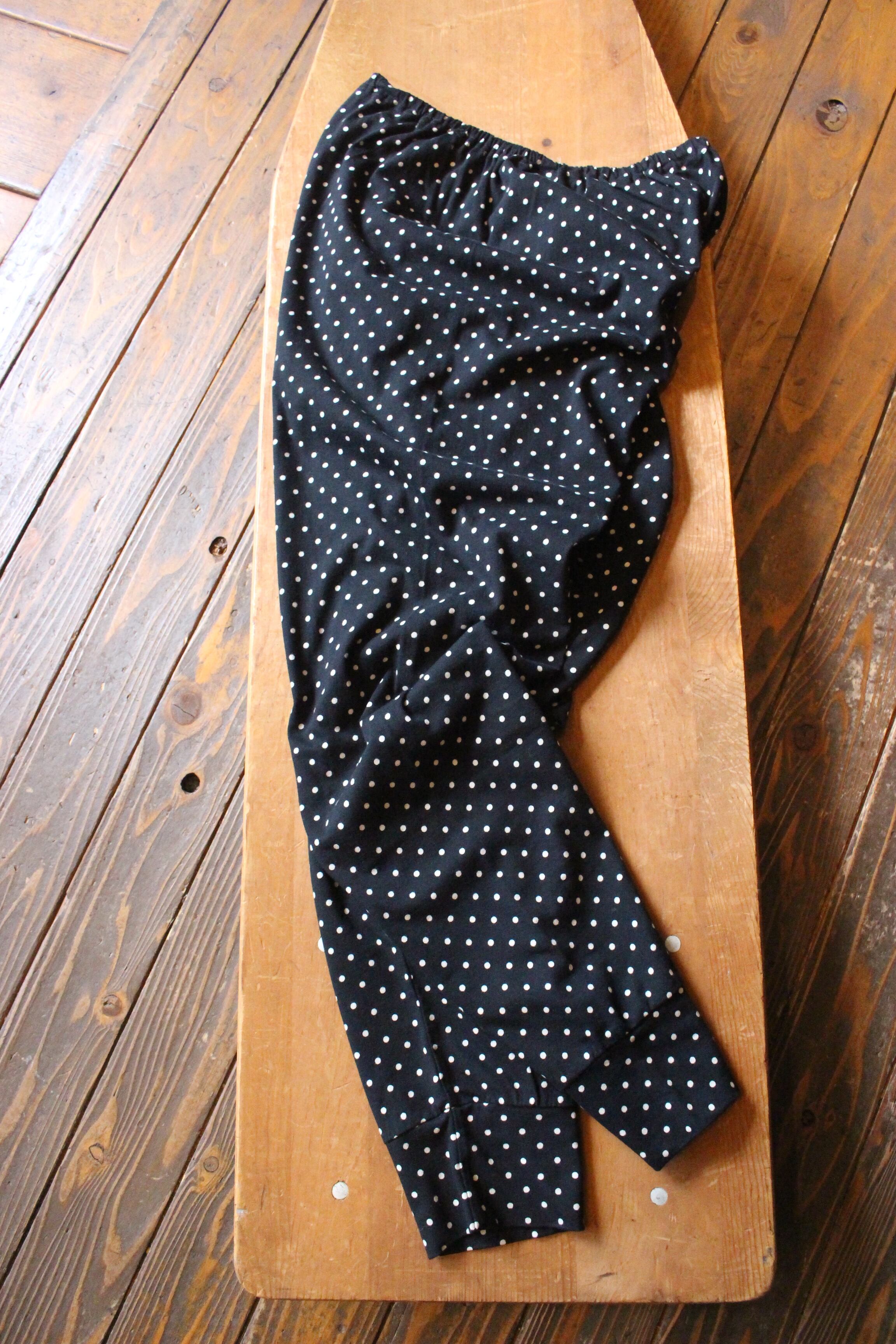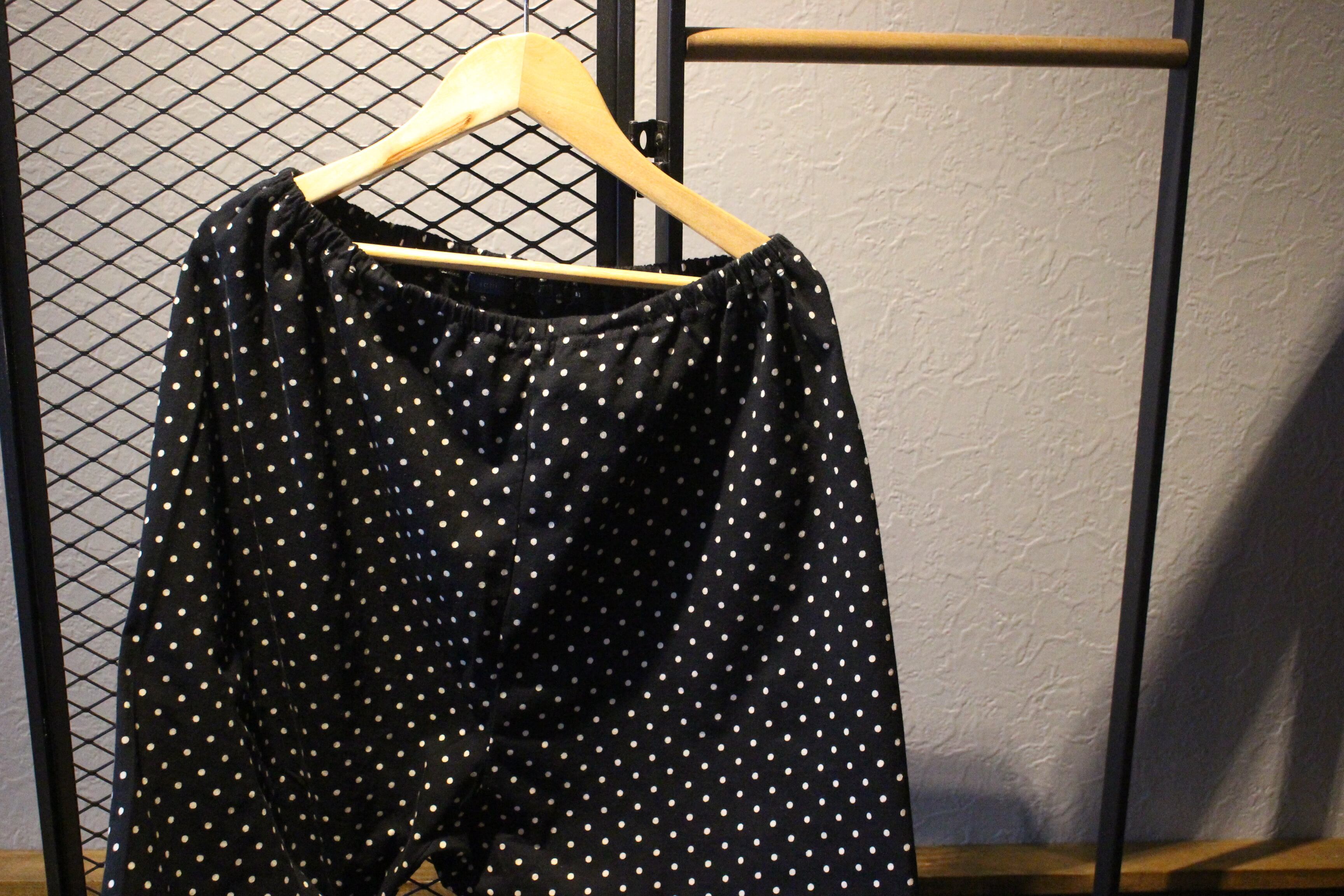ゆったりとした股上、程よくサルエルラインになったリラックスシルエット。伸縮性もあり締め付け感もないのでイージーパンツ感覚で穿けるのも人気のポイントです♪細かいブラックドット柄はかわいくなりすぎないのでコーデのさりげないアクセントに♪