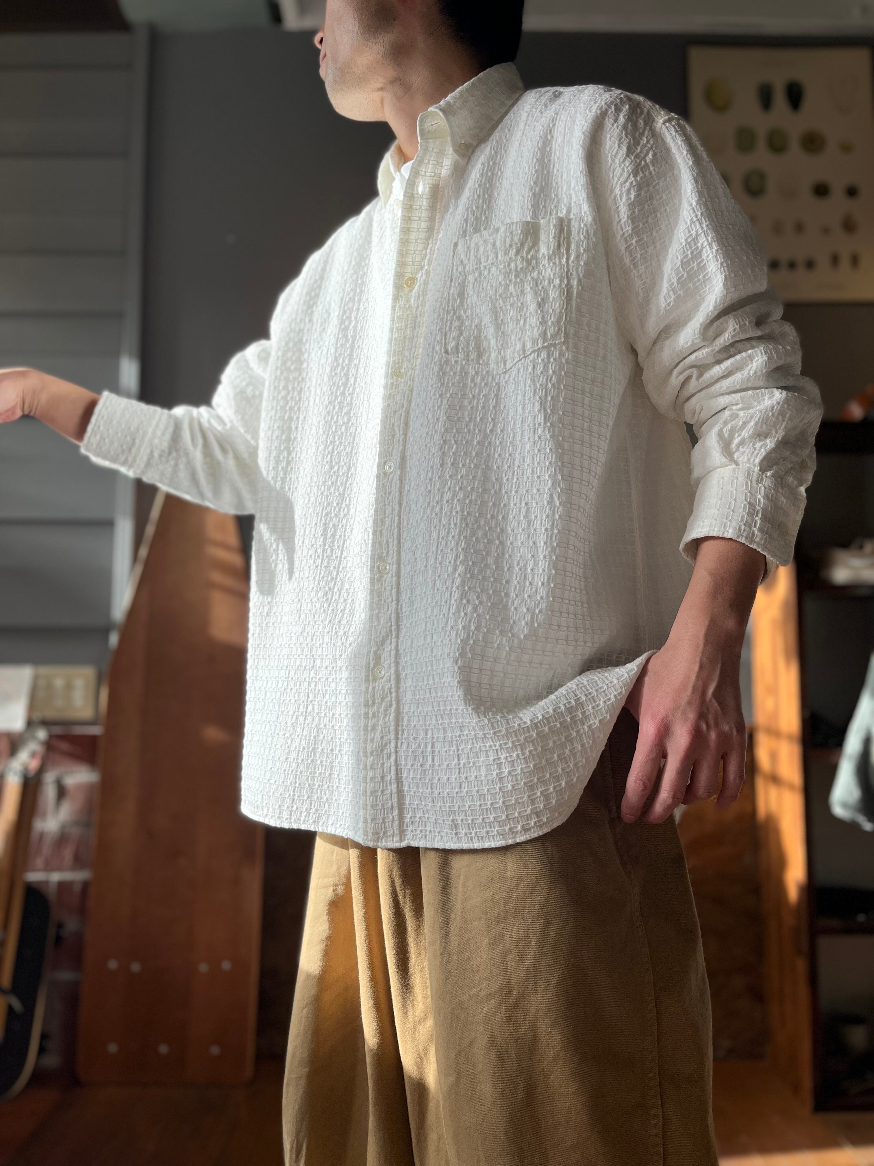ボクシーシルエットなのでワイドパンツや軍パンなどカジュアルに合わせてもハマる万能シャツですよ。