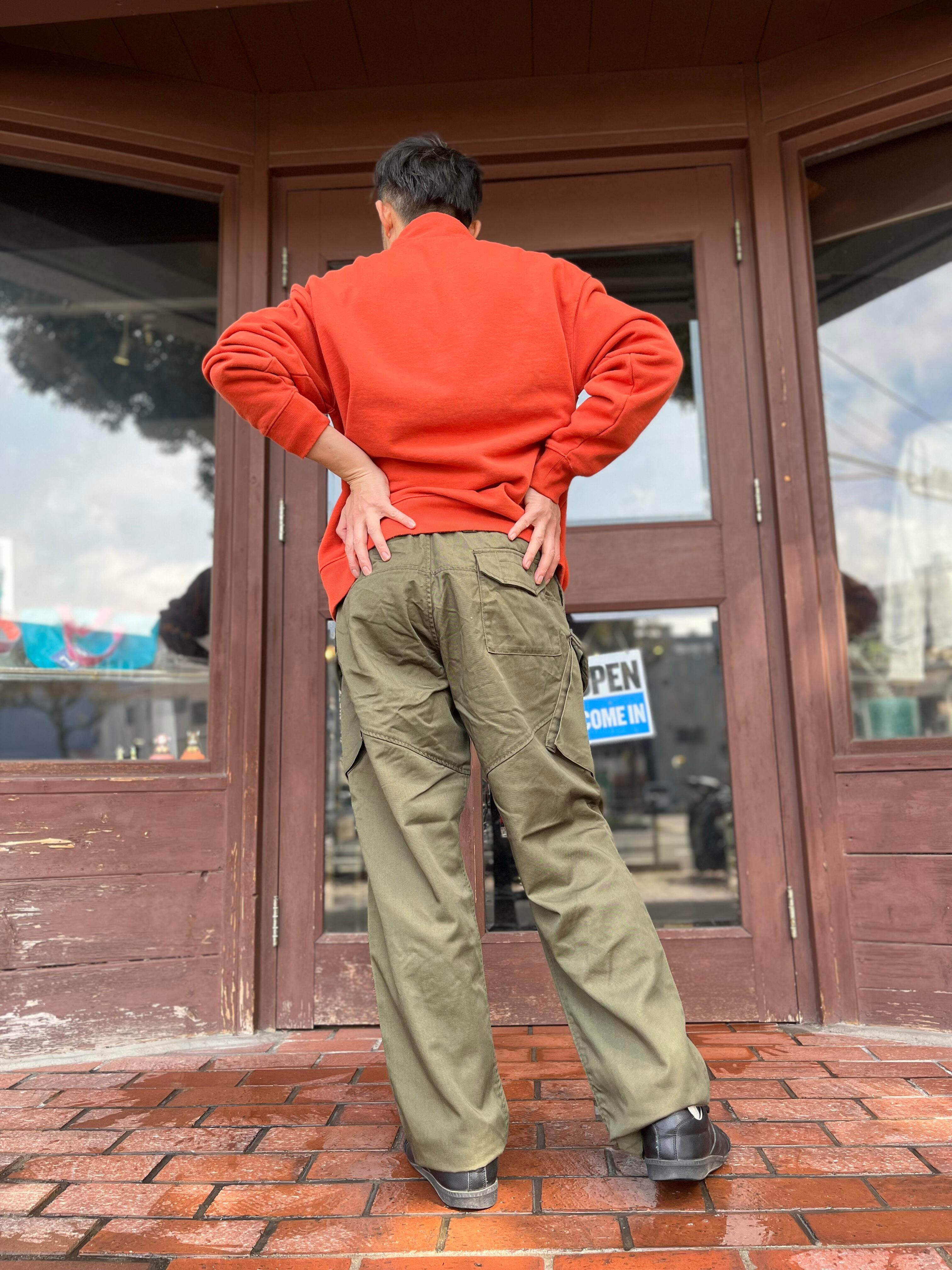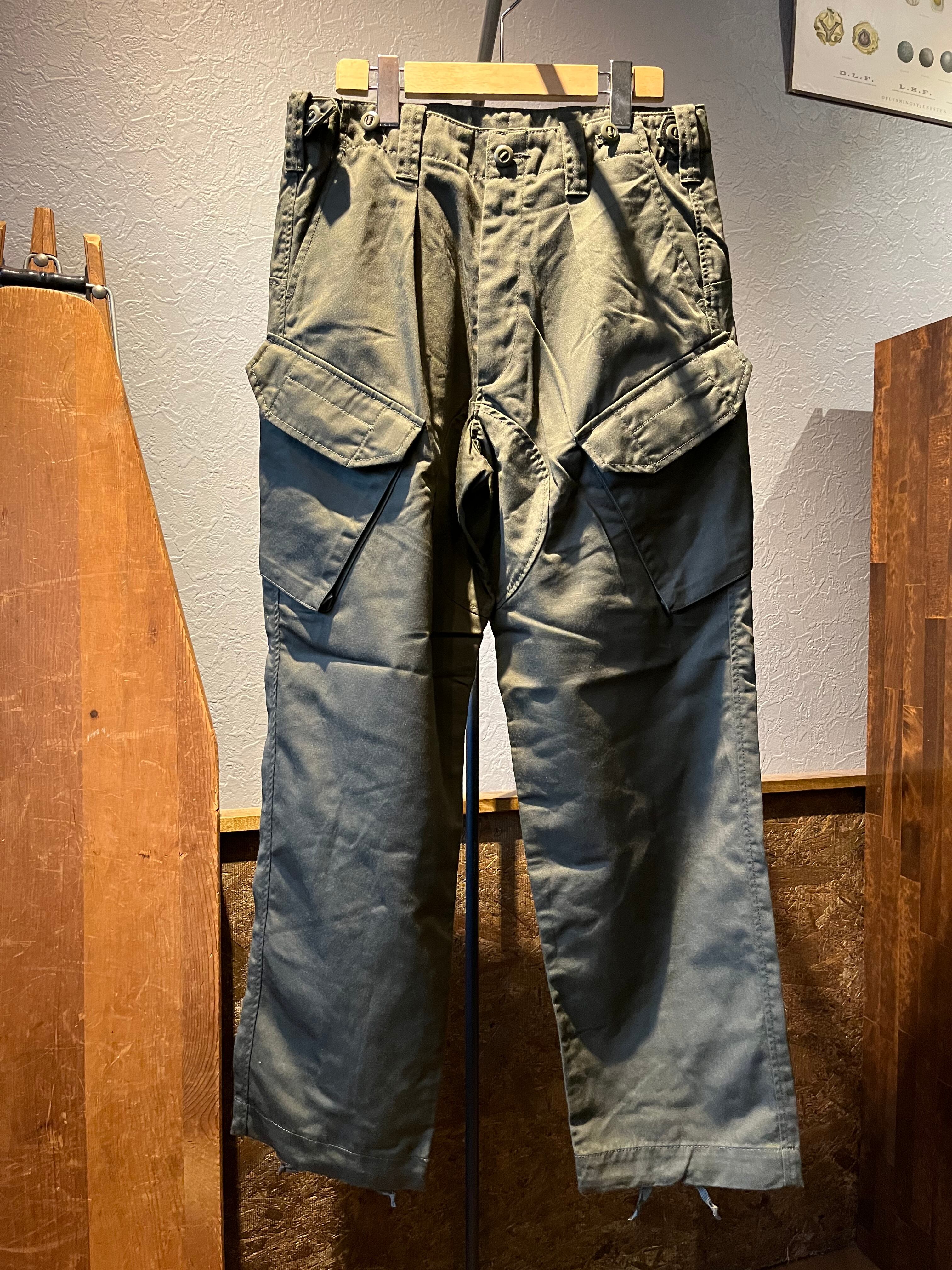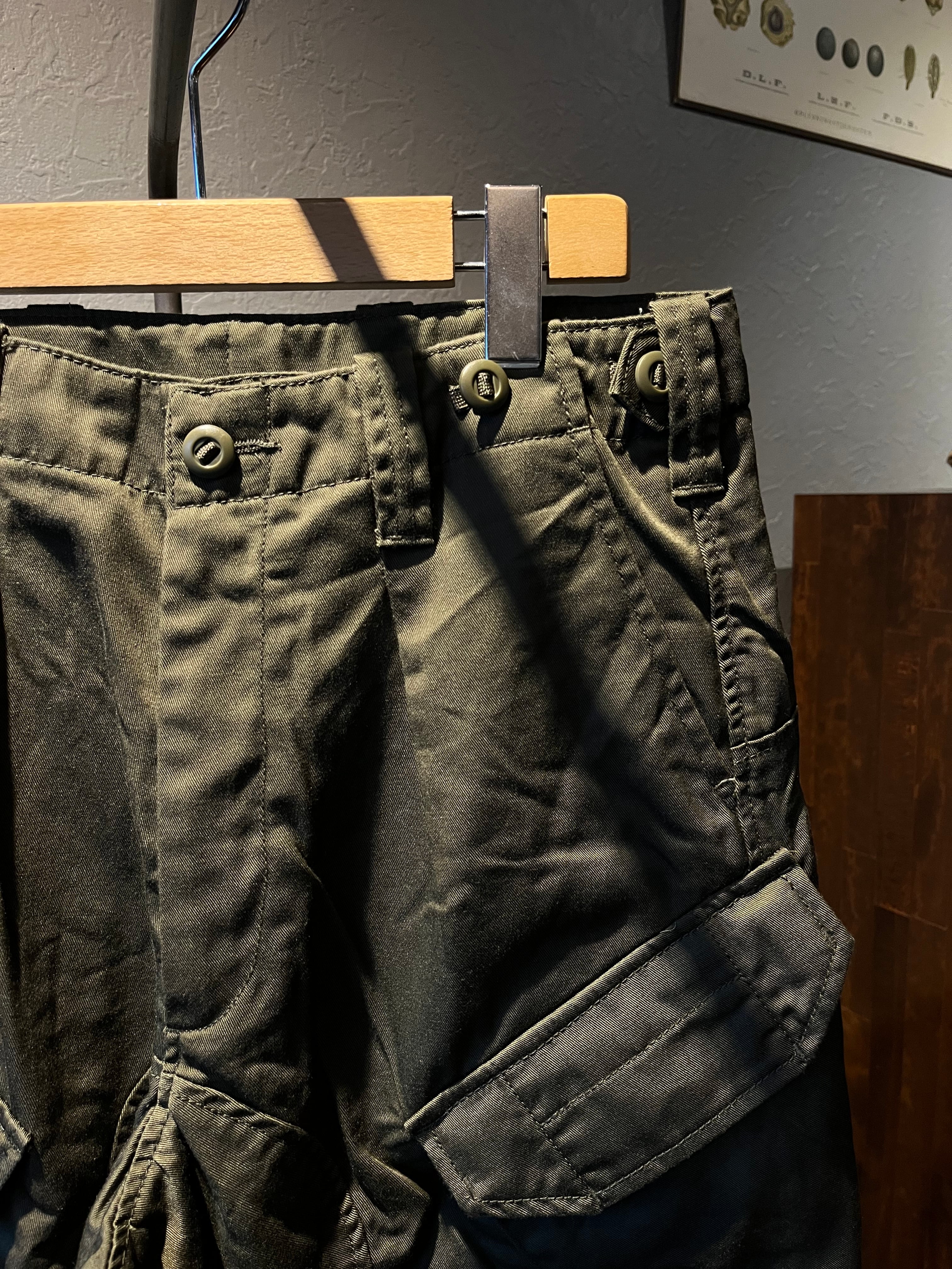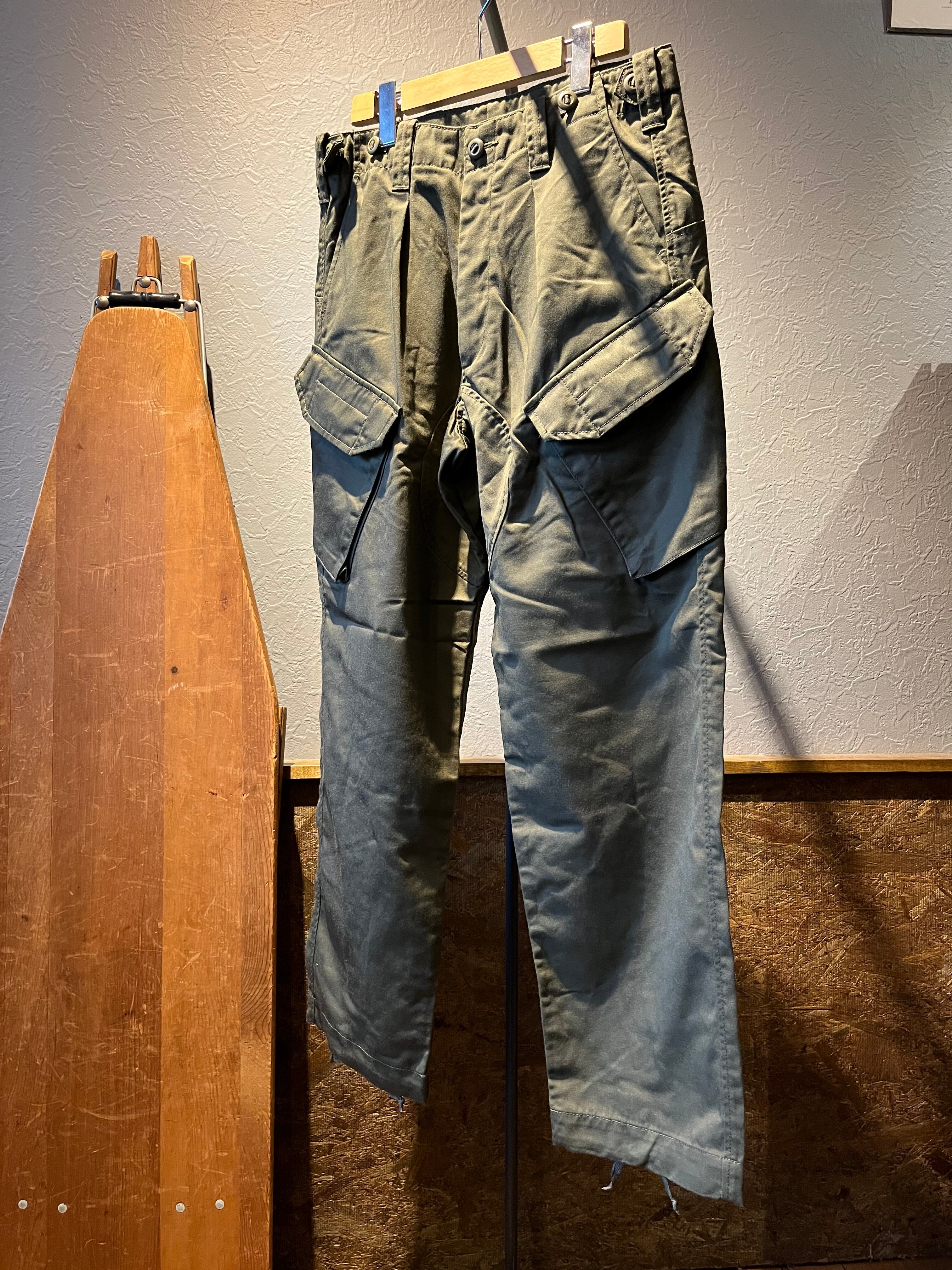 狭い艦内で座ったままでも使いやすいよう斜めに配置されたカーゴポケットが特徴。ウエストのアジャスターでベルト要らず。補強のデザインの股の切り替えやパラシュートボタンなどなどディテール満載なカーゴ。
