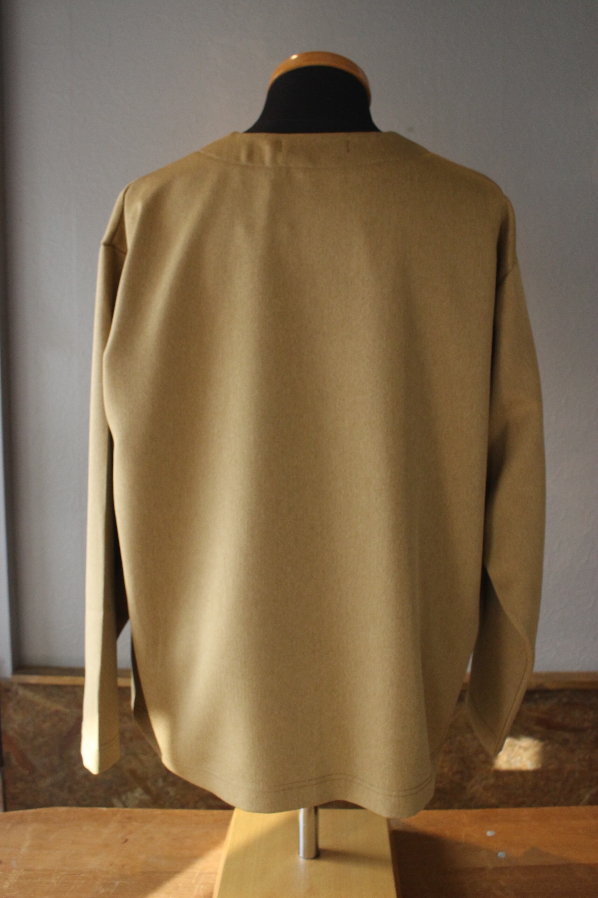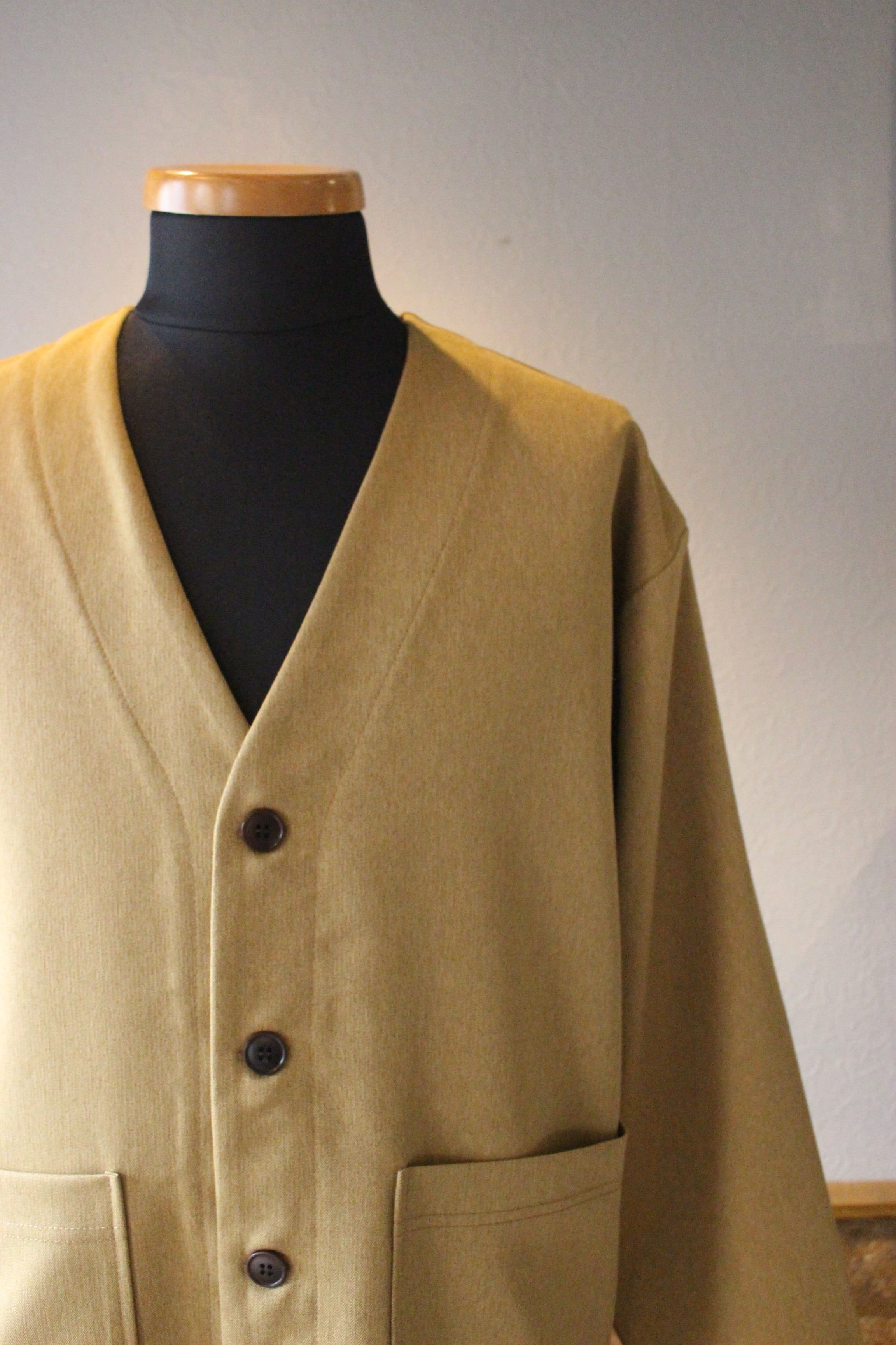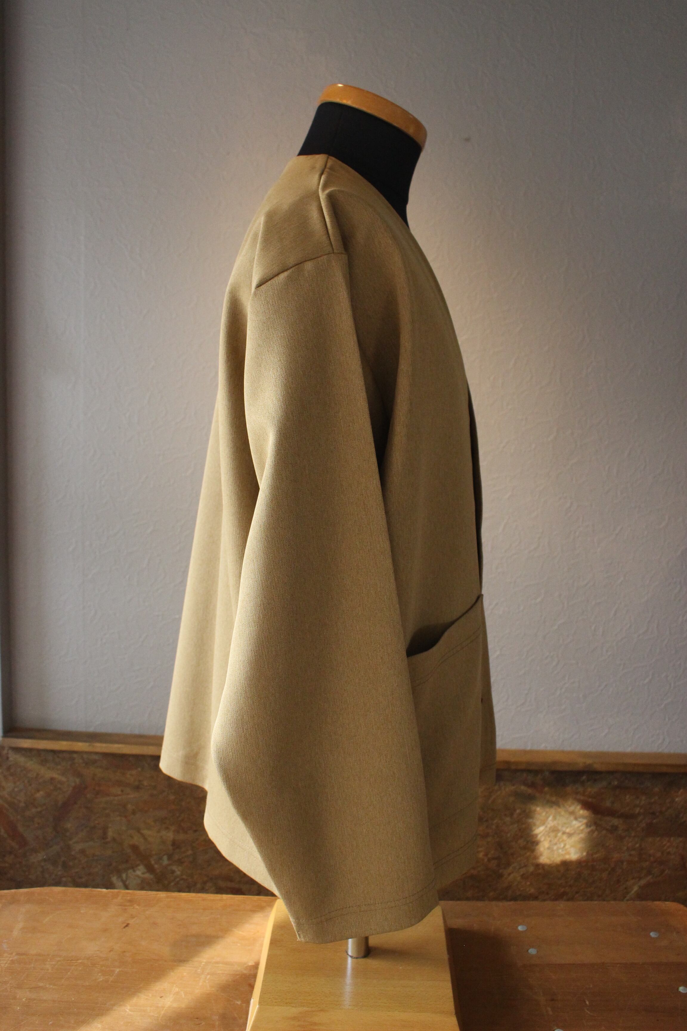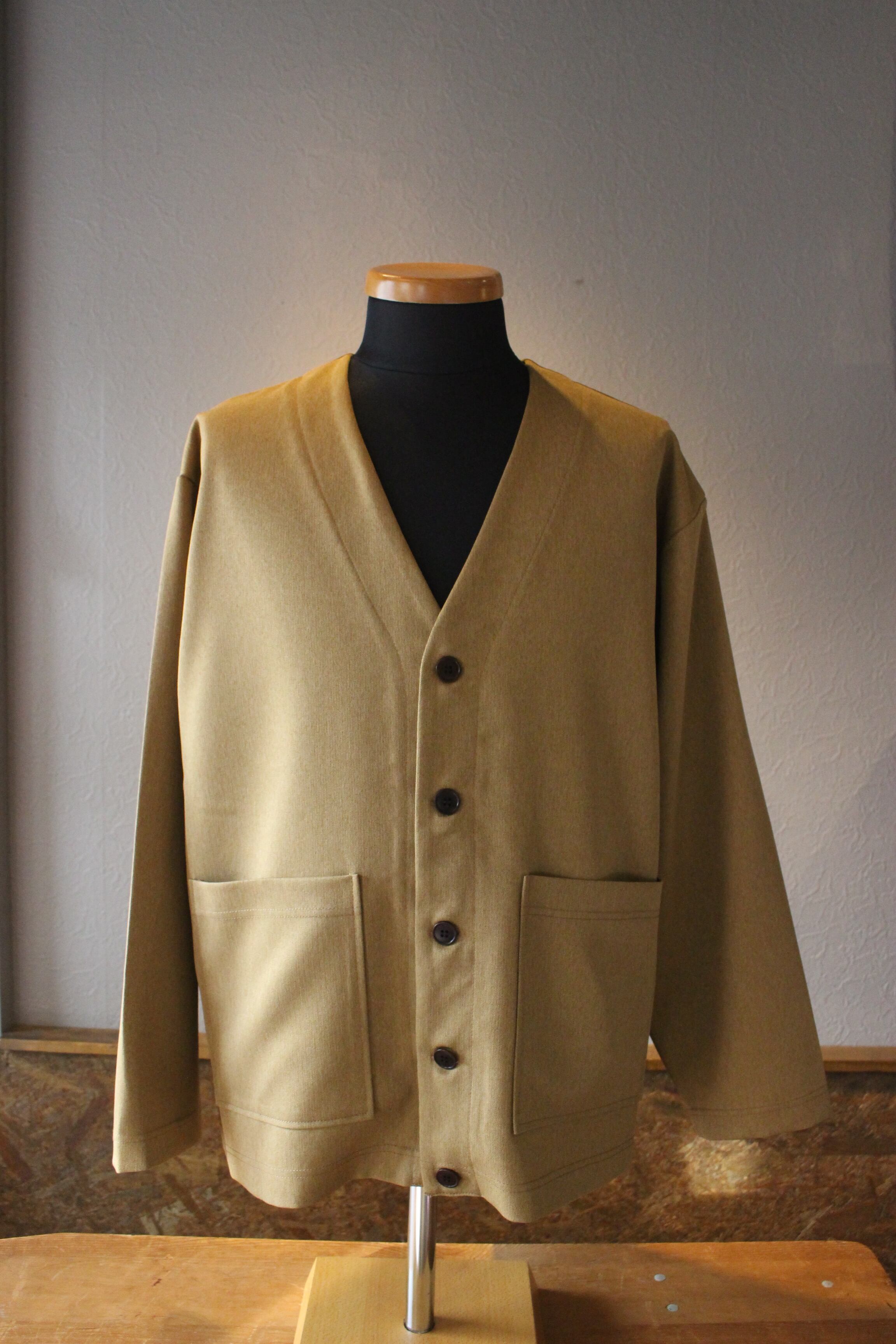 ノーカラーなのでジャケットほどかっちりせず、カーディガン感覚で着回しの高い作り。