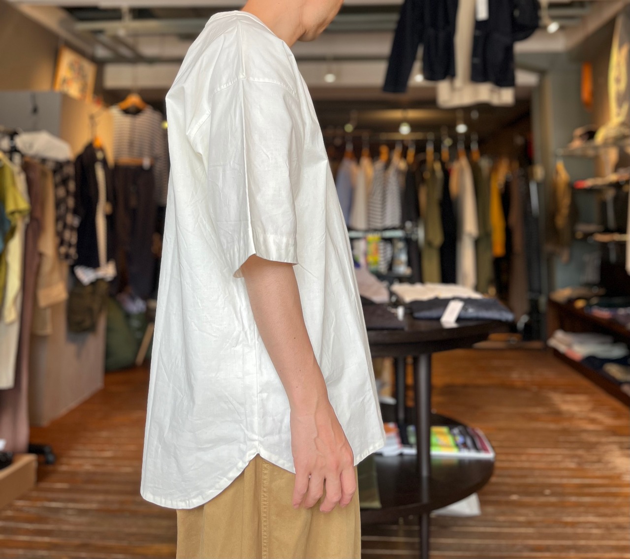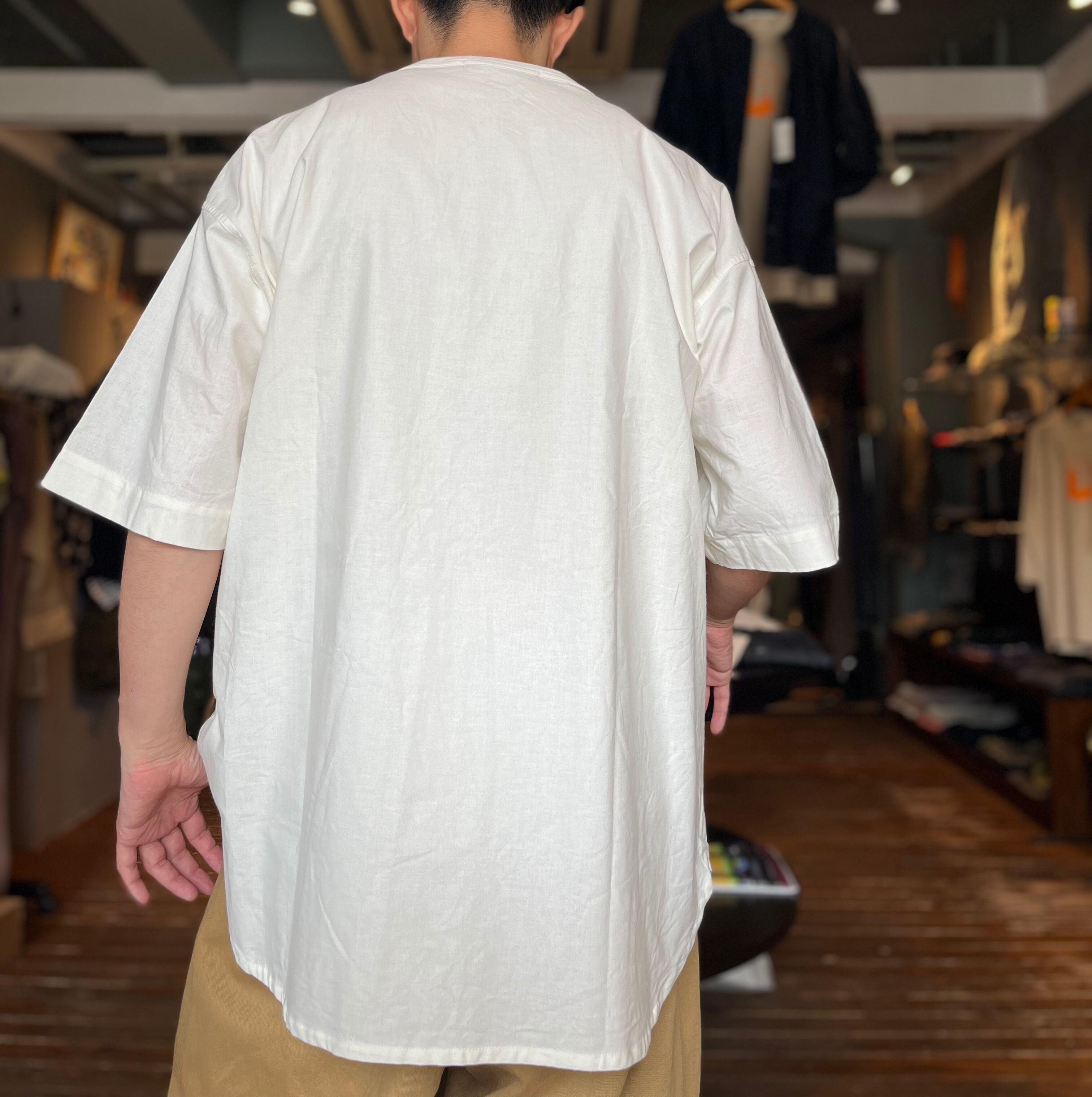 サラッと肌触りの良いコットンシーチングを使用。Tシャツスタイルより上品でありながらリラックスした着心地。襟のリブやステッチなど同色でまとまりのあるシャツ。