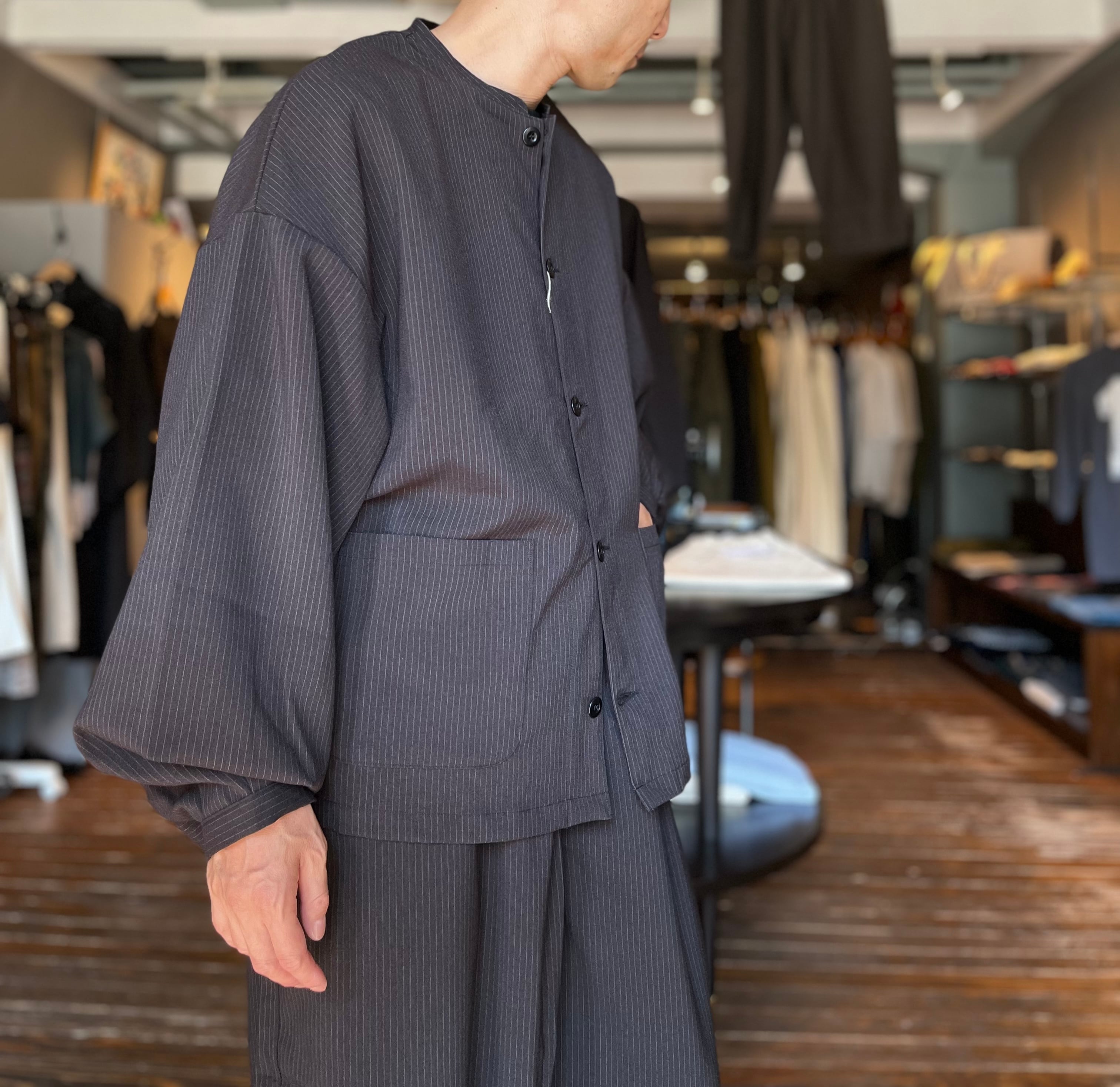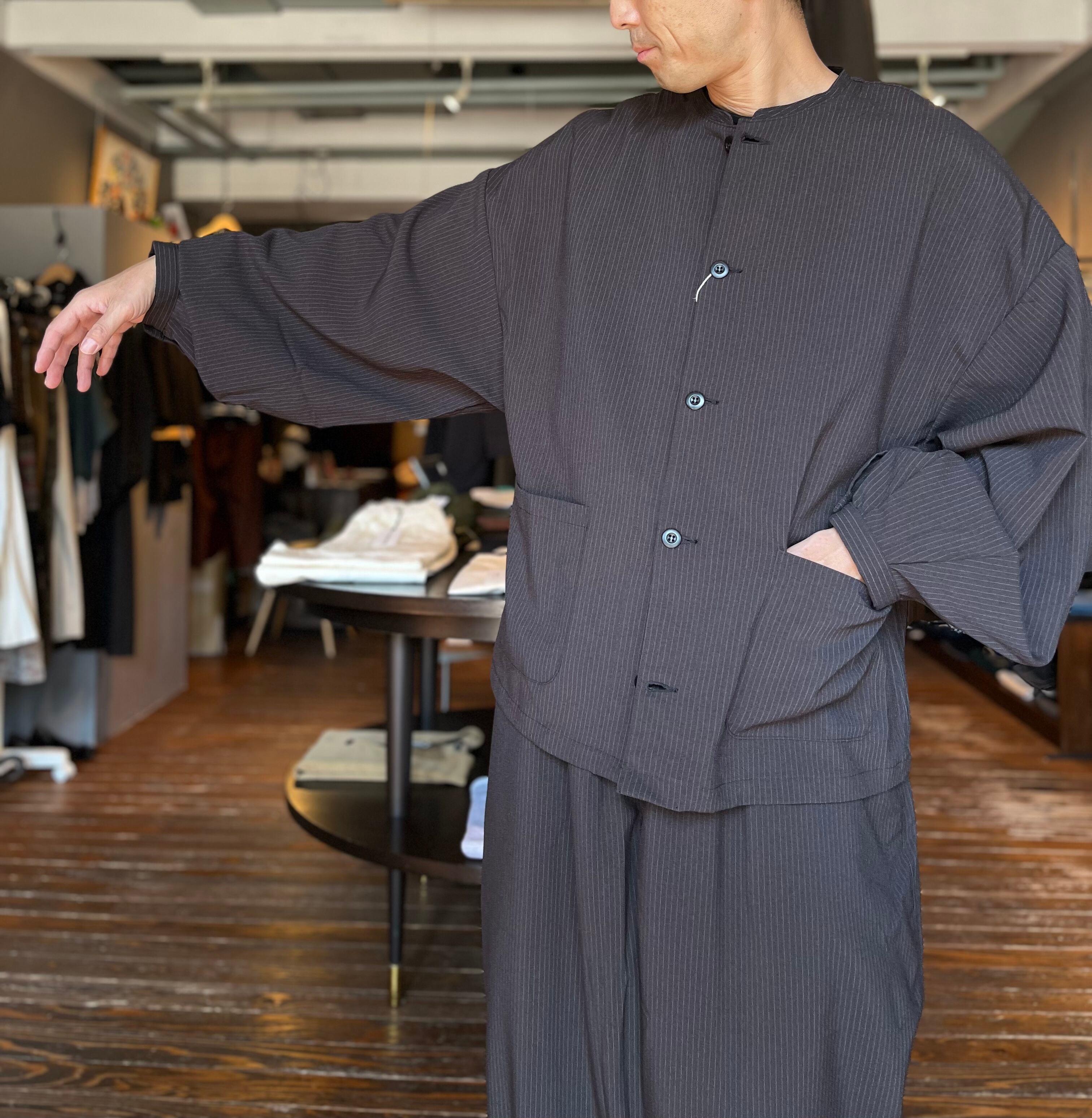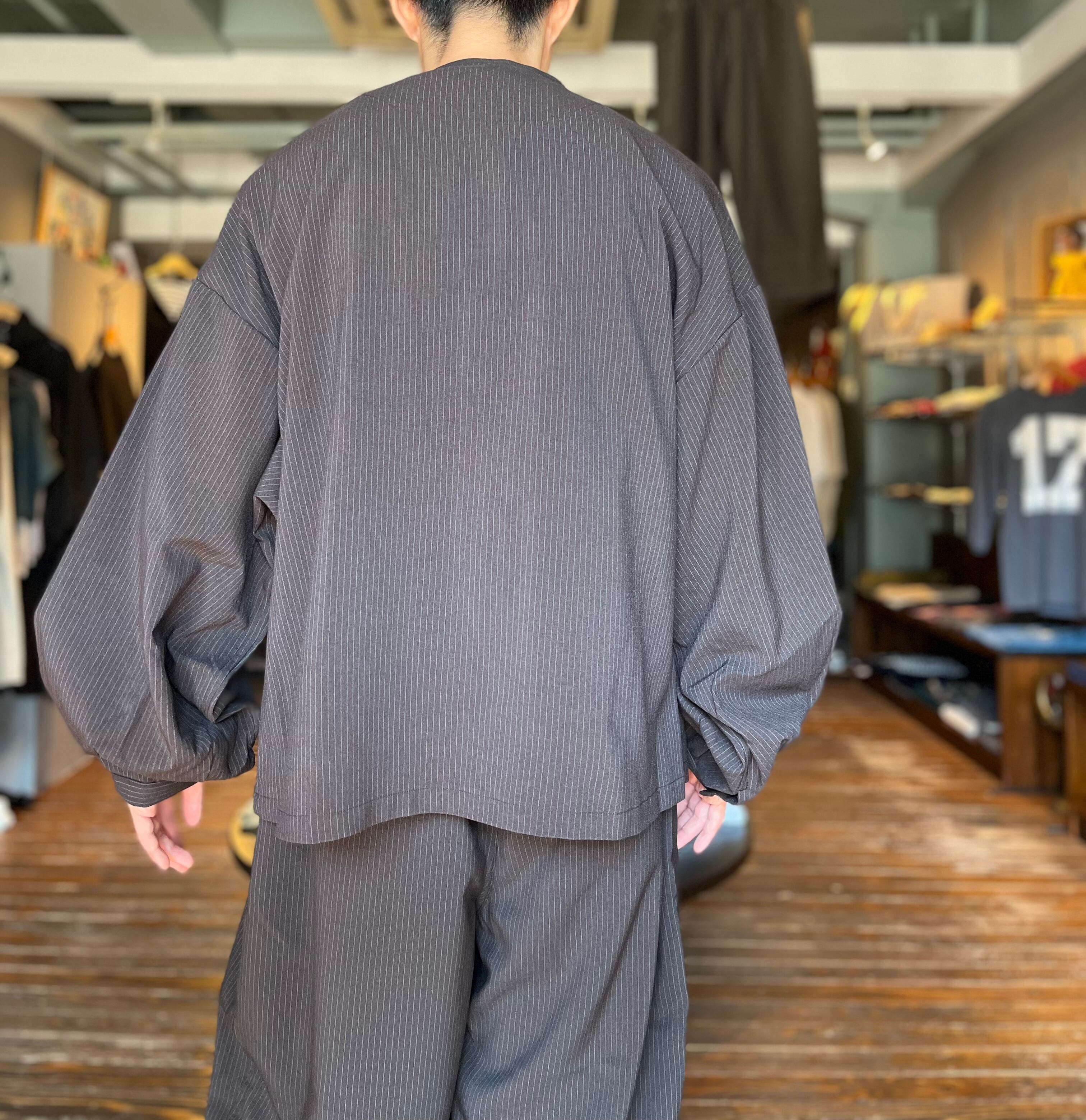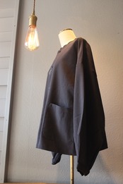 とても軽くサラっとした肌触りはポリエステル、レーヨンを使用。もちろんご自宅でお洗濯可能です。定番のアトリエジャケットと同じドロップショルダーですがアームはかなり広くゆったりとしたインナーとも重ね着しやすい作りに。