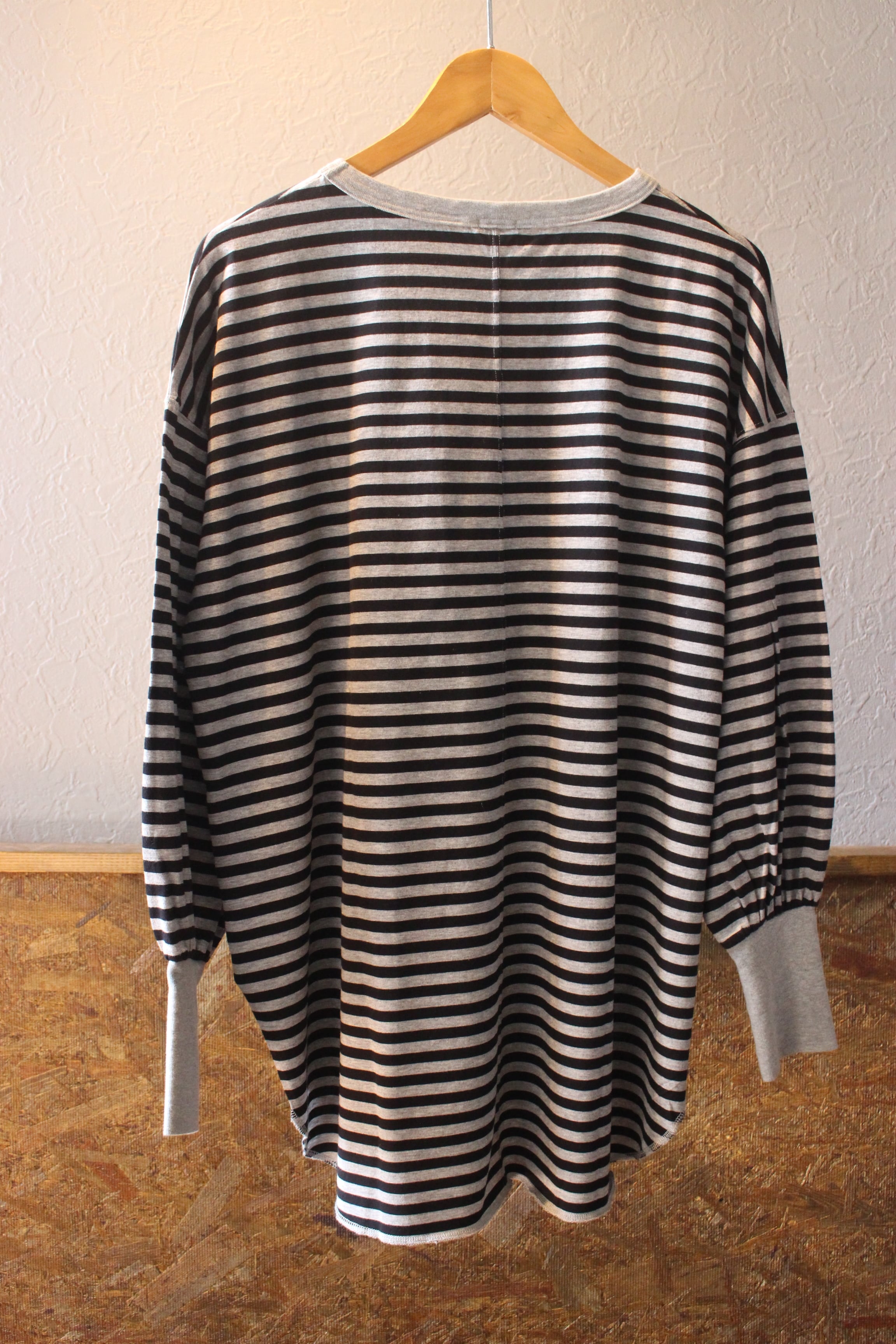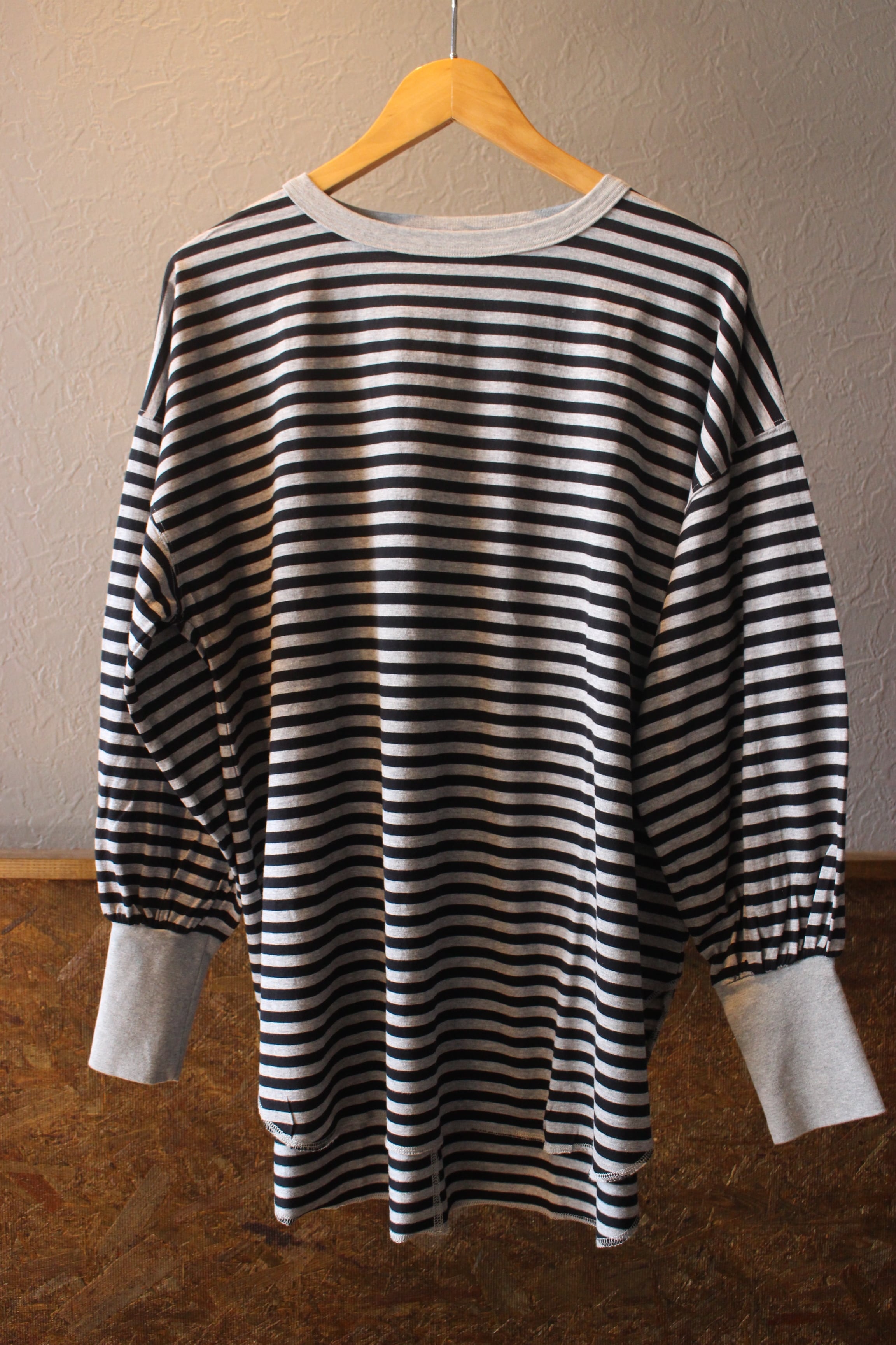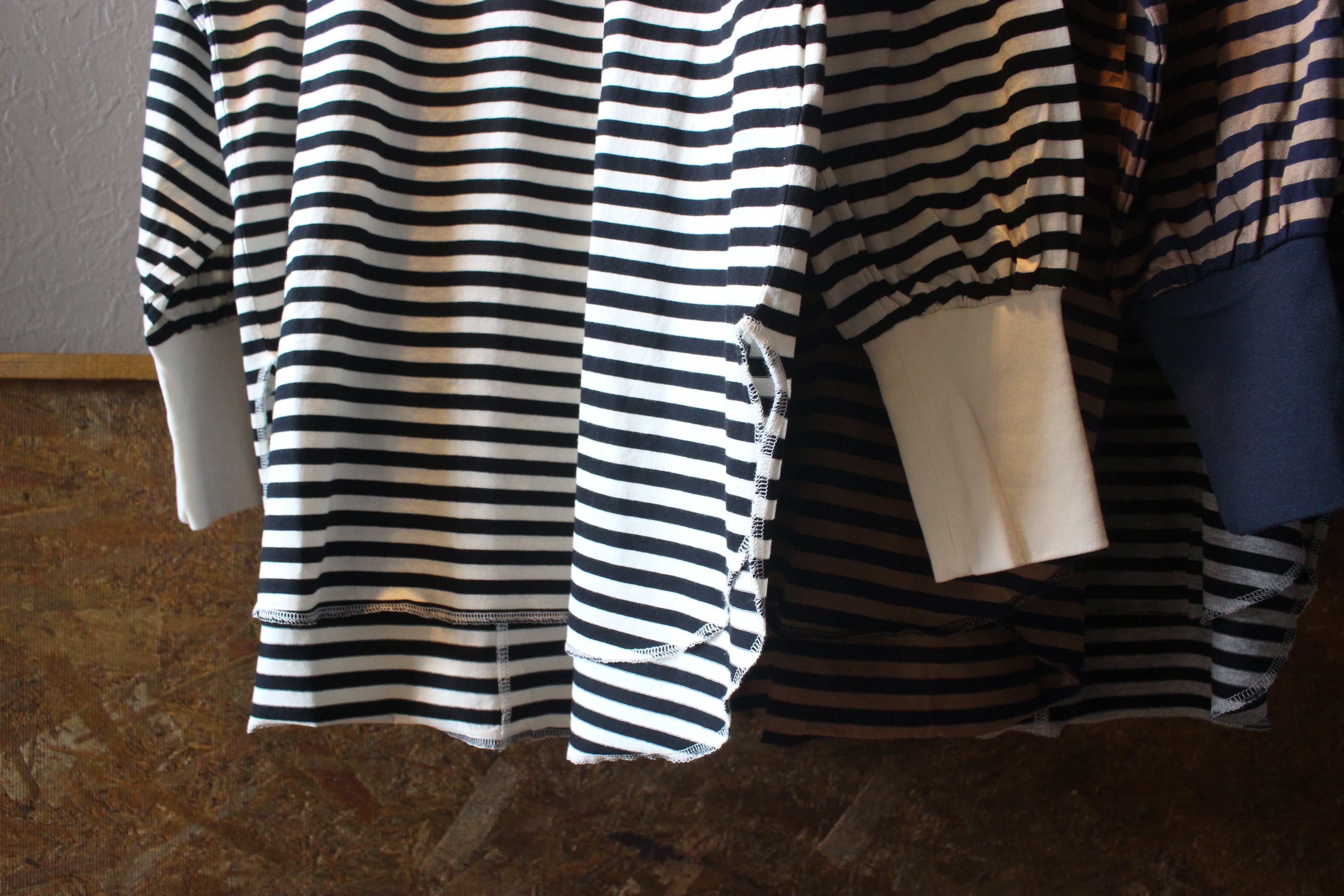 長めの袖リブ、前後差のあるラウンドした裾がアクセントになったボーダー。