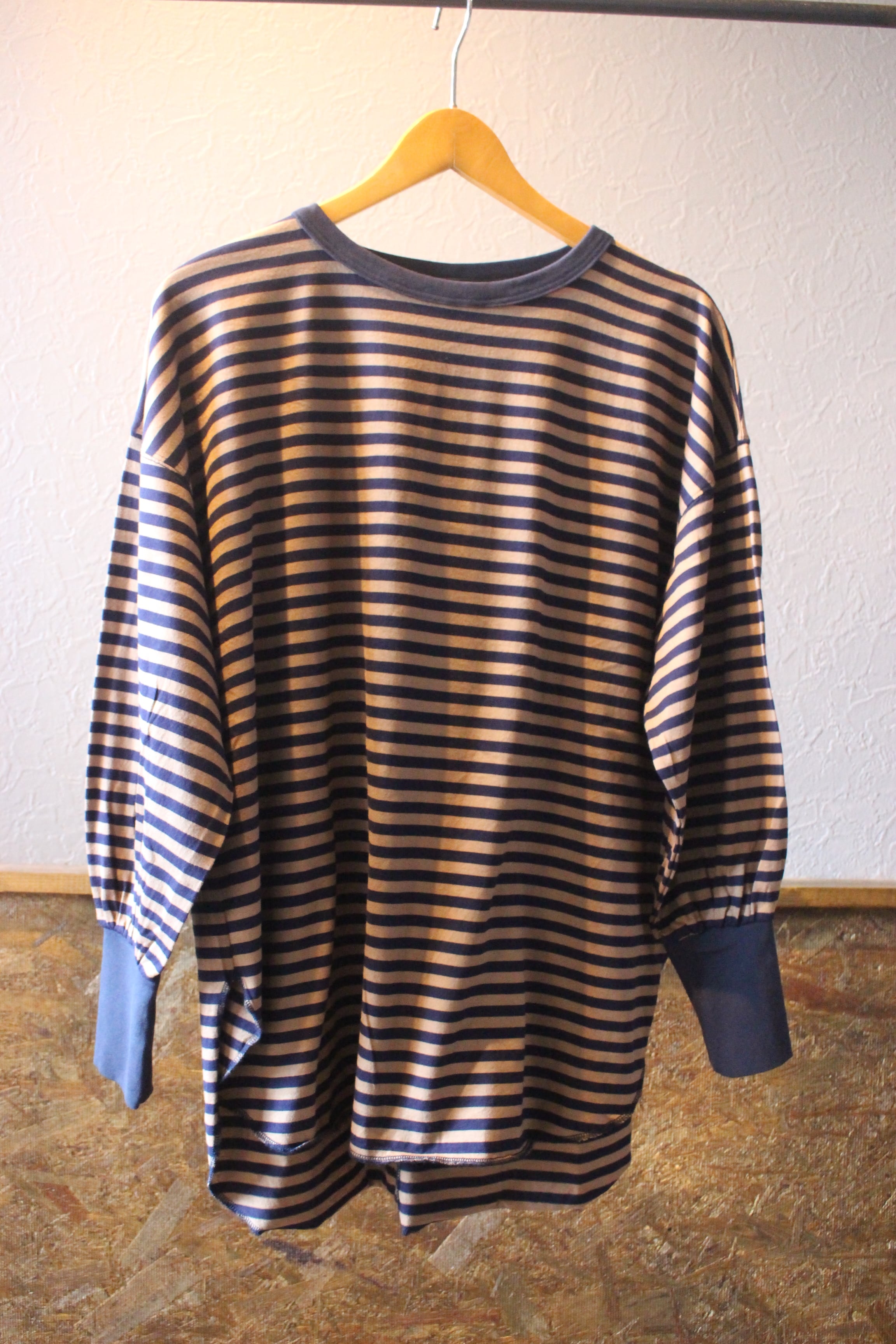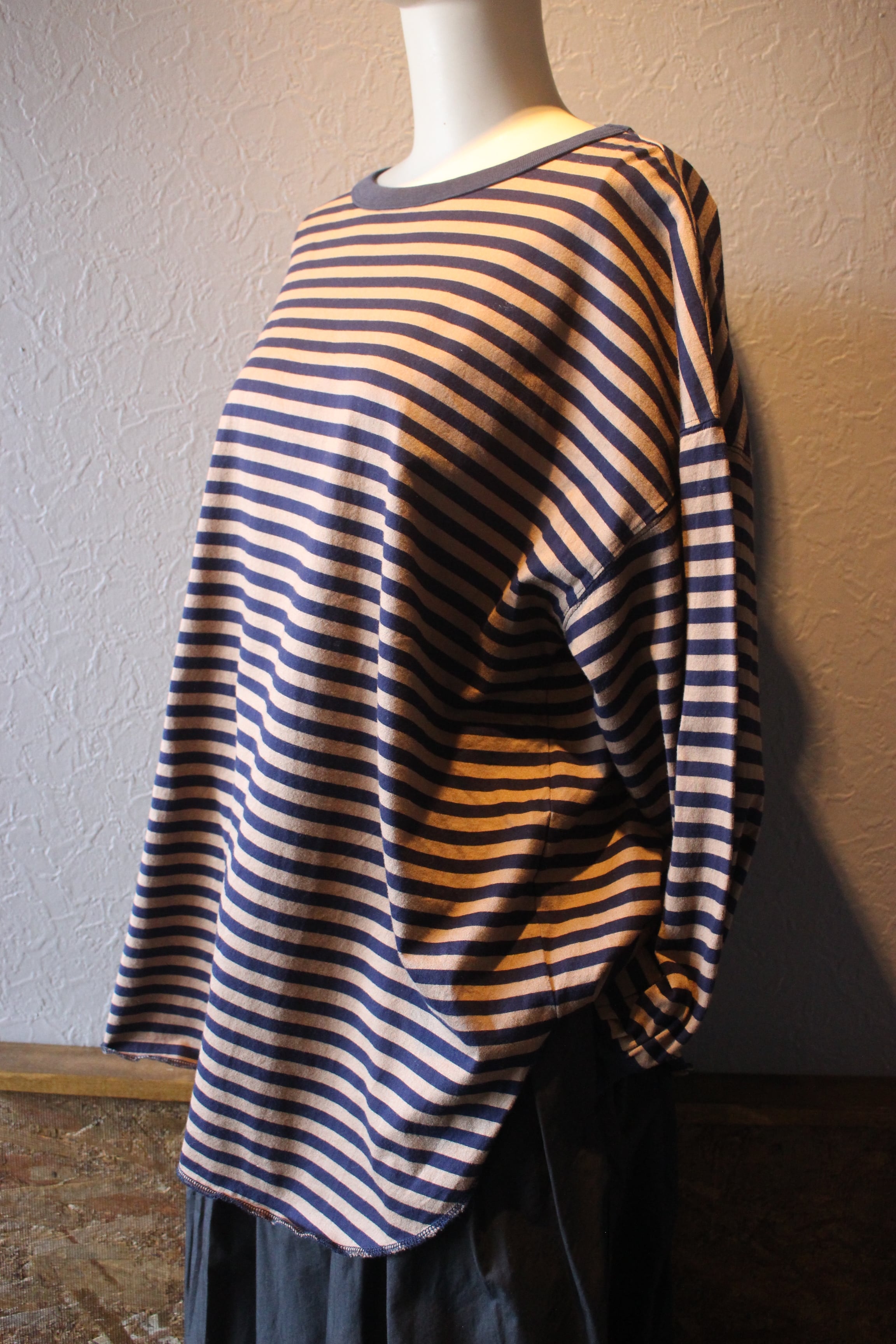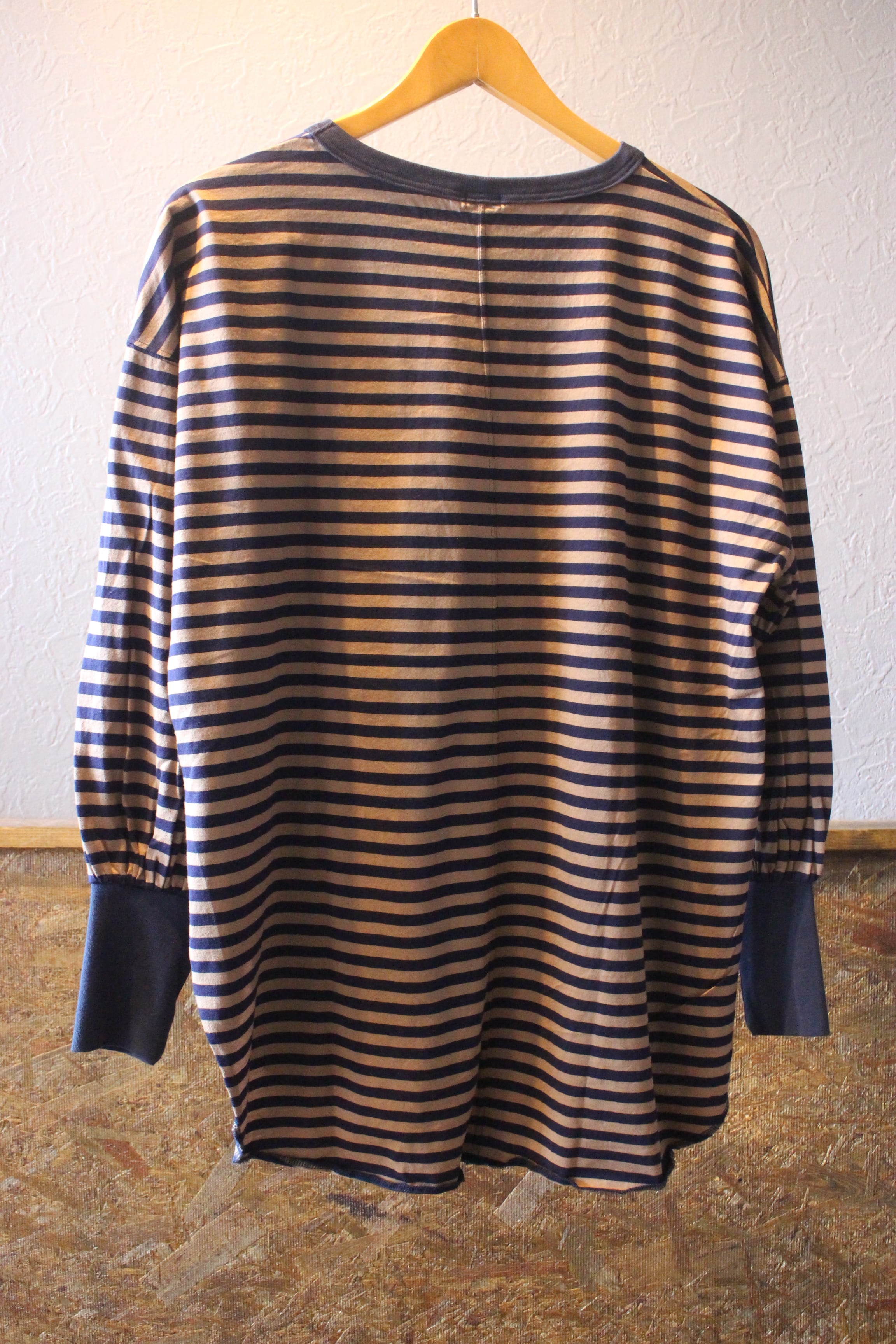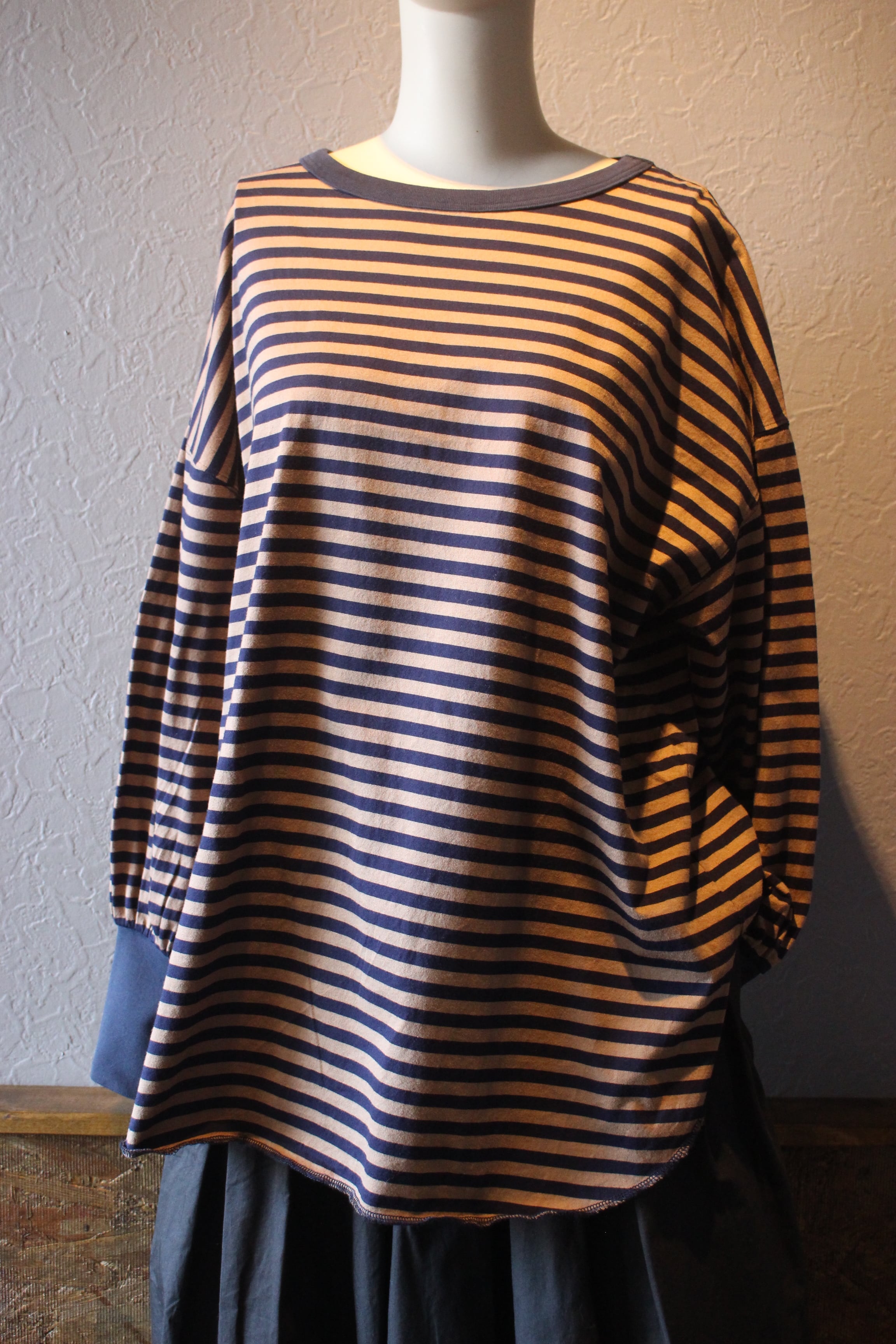 長めの袖リブ、前後差のあるラウンドした裾がアクセントになったボーダー。